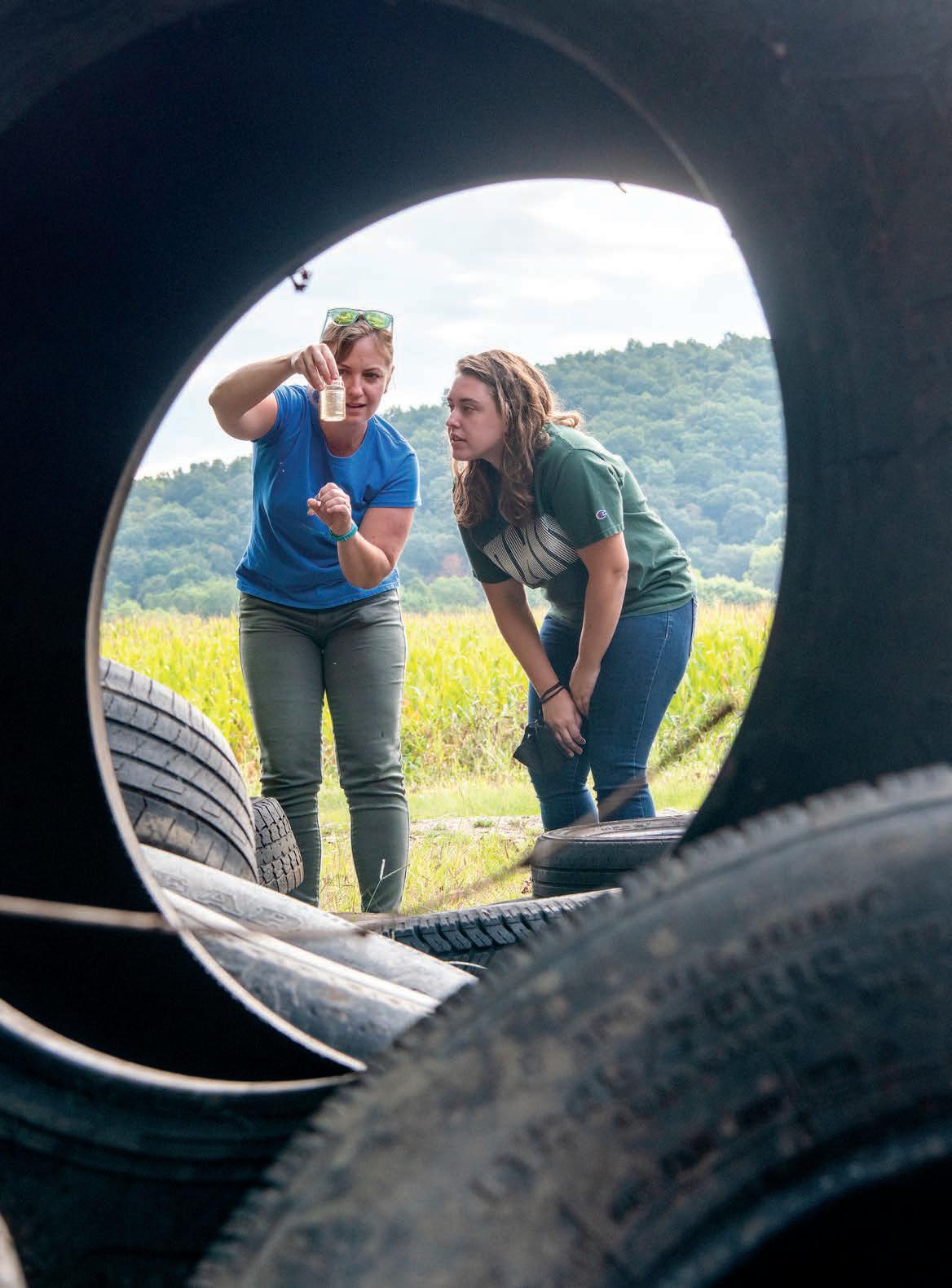 Dr. Bekka Brodie and OHIO Honors Program student and actuarial science major Claire Keiser examine mosquito pupae developing inside tires awaiting disposal at an Athens County site. Brodie brought Keiser, an aspiring statistician looking to broaden her studies from theoretical statistics to applied statistics, into her lab to develop models and predictions based on mosquito data collected by health departments across Ohio, several of which employ OHIO students to conduct their summer surveillance programs.