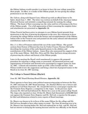 the Ohlone Indians would consider it an honor to have the new college named for their people. In effect, as a leader of the Ohlone people, he was giving the college permission to use the name. Mr. Galvan, along with Rupert Costo, followed up with an official letter to Dr. Epler, dated June 7, 1967. The letter was written on behalf of the American Indian Historical Society and included a compelling rationale for naming the college Ohlone. The heart of their reasoning was the value and love of learning in the lives of the Ohlone people. For a full appreciation of their reasoning the complete letter and attachments are presented as Appendix 14. Wilma Prewitt had been active in attempts to save Ohlone burial grounds from destruction in the face of growing development in the area. Her statement in favor of naming the college Ohlone traced the history and accomplishments of the Ohlone Indian tribe in the Fremont area and pointed out the early cultural and educational contributions made to the area. Mrs. J. A. Silva of Fremont endorsed the use of the name Ohlone. She quoted sections from History of Mission San Jose by Father Francis Florence McCarthy describing the reactions of the early Spanish priests to the abilities and contributions of the Ohlone Indians. James Bray also announced his support of the use of the name Ohlone. Both Mrs. Silva and Mr. Bray had been strong advocates of preserving the culture and history of the Ohlone people. Later in the meeting the Board voted unanimously to approve the proposed procedure for selecting a college name as presented. All interested persons and organizations of Fremont and Newark were encouraged to suggest names by June 12, 1967. A Board sub-committee made up of Mr. John Costello and Rev. Jack Wilson would review the suggestions and bring a short list of proposed names to the Board at its June 28, 1967 meeting. The College is Named Ohlone (Maybe!) June 28, 1967 Board Meeting (Board Minutes, Appendix 15) There appears to have been some political maneuvering going on between the May 31, 1967 and June 28, 1967 Board meetings. Dr. Marilyn Blawie was a lawyer and professor at Cal State Hayward. Mr. Joseph McCord was a newspaper reporter for the Fremont News-Register, a competitor to the Argus. In the previous April elections Mr. McCord had defeated Dr. Blawie for a seat on the junior college Board. The Argus also reported on June 19 that Dr. Blawie had threatened a $250,000 libel suit against the Fremont News-Register and Mr. McCord, a reporter for the paper, for libel and defamation related to news reports of Board meetings. Dr. Blawie was known to be in favor of the name Ohlone for the college and Mr. McCord was thought to have other names in mind. The June 28 meeting was to be Dr. Blawie’s last meeting before Mr. McCord replaced her in July, and Mr. McCord had an interest in delaying the naming decision until he was officially on the Board.