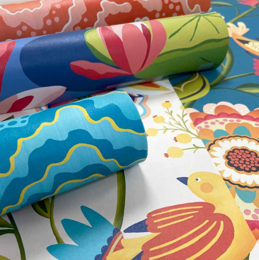 Stylised birds perch upon a cheerful trail in this modern Indian inspired floral wallpaper. Bold and brightly coloured throughout, the imaginative contemporary flower heads and leaves incorporate a tactile aesthetic adding texture and a subtle depth to the design.