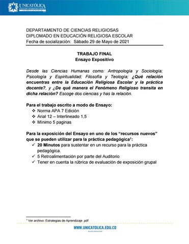 DEPARTAMENTO DE CIENCIAS RELIGIOSAS DIPLOMADO EN EDUCACIÓN RELIGIOSA ESCOLAR Fecha de socialización: Sábado 29 de Mayo de 2021 TRABAJO FINAL Ensayo Expositivo Desde las Ciencias Humanas como: Antropología y Sociología; Psicología y Espiritualidad; Filosofía y Teología; ¿Qué relación encuentras entre la Educación Religiosa Escolar y la práctica docente?, y ¿De qué manera el Fenómeno Religioso transita en dicha relación? Escoge dos ciencias y has la relación. Para el trabajo escrito a modo de Ensayo: Norma APA 7 Edición Arial 12 – Interlineado 1,5 Mínimo 5 paginas Para la exposición del Ensayo en uno de los “recursos nuevos” que se pueden utilizar para la práctica pedagógica1: 20 Minutos para sustentar en un recurso para la práctica pedagógica. 5 Retroalimentación por parte del Auditorio Tener en cuenta la rúbrica de evaluación de exposición grupal