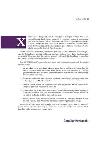 “OIARTZUN 2012” urtekarian, aurrekoetan bezalaxe, Oiartzun herriaren bizitasuna jaso nahi da. Bertan lanean aritu garenok, nork gure harri-koskorra ekarri dugu. Guztion artean, urtean zehar Oiartzunen izan diren gizarte ekintzak, kulturalak, kirol arlokoak, etnografikoak… jaso eta bildu nahi ditugu gure historiarako. Eta “OIARTZUN 2012”-aren atarian gaudenez, gure iritziz, adierazgarrienak diren gaiak aipatuko ditugu: • Aurten, elkarrizketa nagusiaren lekua Josemari Sanzberro Etxebeste jaunak bete du. Izan ere, urtekari honen batzordeko kidea izan da azken hogeita hamar urteetan, eta agurtzeko tenorea iritsi zaiola eta, Josemarirekin bildu eta haren bizitzari errepaso luzea emateko aukera izan dugu. • Nafarroako konkistaren 500. urteurrena den honetan, Gurutzeko Beloaga gaztelua ekarri digu gogora Jose Mari Iturriotzek. • Bestalde, topoak aurten 100 urte beteko ditu. Hori gai hartuta, Antton Mendizabalek Arraguako geltokiari buruzko lana osatu du. • Alaia eta Jon Martin Etxebeste anai-arrebak 2011ko abenduan Gipuzkoako Bertsolari Txapelketako finalean aritu ziren. Hori bada nahiko arrazoi urtekari honetako seme-alaben atalean azaltzeko eta beren bizipenak jasotzeko. • Manuel Lekuona idazle eta euskaltzainaren heriotzaren 25. urteurrena betetzen da aurten. Hori dela eta, Iñaki Arbelaitzek harekin izandako bizipenak aletu dizkigu. Bukatzeko, eskerrak eman nahi dizkiegu gure urtekari honen laguntzaileei eta irakurleei, guztien artean, egunetik egunera, gure herriko historiaren zatia izango dena osatzen ari baikara. Eta, betiko moduan, ozen esango dugu: