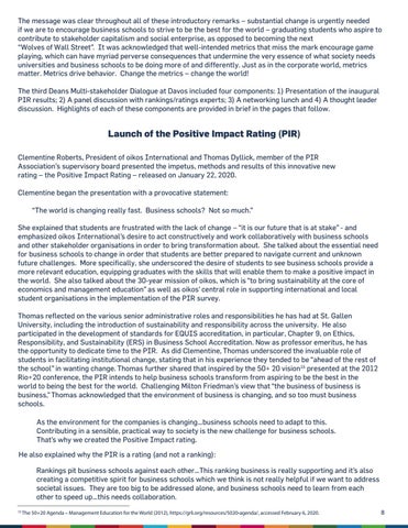 Launch of the Positive Impact Rating (PIR) Clementine Roberts, President of oikos International and Thomas Dyllick, member of the PIR Association’s supervisory board presented the impetus, methods and results of this innovative new rating – the Positive Impact Rating – released on January 22, 2020. Clementine began the presentation with a provocative statement: “The world is changing really fast. Business schools? Not so much.” She explained that students are frustrated with the lack of change – “it is our future that is at stake” - and emphasized oikos International’s desire to act constructively and work collaboratively with business schools and other stakeholder organisations in order to bring transformation about. She talked about the essential need for business schools to change in order that students are better prepared to navigate current and unknown future challenges. More specifically, she underscored the desire of students to see business schools provide a more relevant education, equipping graduates with the skills that will enable them to make a positive impact in the world. She also talked about the 30-year mission of oikos, which is “to bring sustainability at the core of economics and management education” as well as oikos’ central role in supporting international and local student organisations in the implementation of the PIR survey. Thomas reflected on the various senior administrative roles and responsibilities he has had at St. Gallen University, including the introduction of sustainability and responsibility across the university. He also participated in the development of standards for EQUIS accreditation, in particular, Chapter 9, on Ethics, Responsibility, and Sustainability (ERS) in Business School Accreditation. Now as professor emeritus, he has the opportunity to dedicate time to the PIR. As did Clementine, Thomas underscored the invaluable role of students in facilitating institutional change, stating that in his experience they tended to be “ahead of the rest of the school” in wanting change. Thomas further shared that inspired by the 50+ 20 vision15 presented at the 2012 Rio+20 conference, the PIR intends to help business schools transform from aspiring to be the best in the world to being the best for the world. Challenging Milton Friedman’s view that “the business of business is business,” Thomas acknowledged that the environment of business is changing, and so too must business schools. As the environment for the companies is changing…business schools need to adapt to this. Contributing in a sensible, practical way to society is the new challenge for business schools. That’s why we created the Positive Impact rating. He also explained why the PIR is a rating (and not a ranking): Rankings pit business schools against each other…This ranking business is really supporting and it’s also creating a competitive spirit for business schools which we think is not really helpful if we want to address societal issues. They are too big to be addressed alone, and business schools need to learn from each other to speed up…this needs collaboration. 15