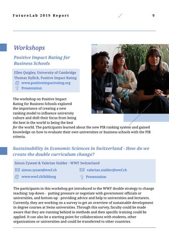 Workshops Positive Impact Rating for Business Schools Ellen Quigley, University of Cambridge Thomas Dyllick, Positive Impact Rating www.positiveimpactrating.org Presentation The workshop on Positive Impact Rating for Business Schools explored the importance of creating a new ranking model to influence university culture and shift their focus from being the best in the world to being the best for the world. The participants learned about the new PIR ranking system and gained knowledge on how to evaluate their own universities or business schools with the PIR criteria.