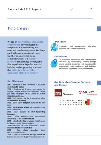 Our Milestones 1987 - Students at the University of St.Gallen start oikos St. Gallen 1998 - Students at 4 other universities in Europe: Cologne, Prague, Stockholm and Vienna join their colleagues in St. Gallen to launch oikos international. 2000 – PhD students for the first time join oikos PhD Summer Academy 2003 - oikos Cases Program runs for the first time 2004 – oikos Winter School is introduced to the oikos community 2006 – oikos launches the PhD Fellowship Program 2011 - oikos welcomes our international community to the first FutureLab 2015 - oikos leadership program - LEAP opens its doors to young change-makers 2016 - oikos and UN PRME join forces to launch the oikos-PRME Research Hub 2016 first oikos Associate joins our international team 2019 - oikos Curriculum Change Initiative launched to support chapters' curriculum work