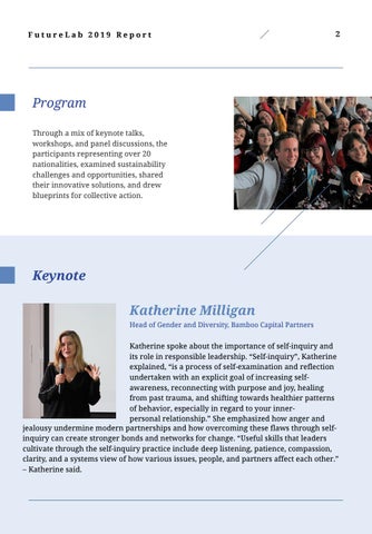 Program Through a mix of keynote talks, workshops, and panel discussions, the participants representing over 20 nationalities, examined sustainability challenges and opportunities, shared their innovative solutions, and drew blueprints for collective action.