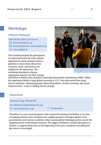 Workshops Climate Dialogue Elise Buckle, SDGs Lab Geneva elise.buckle@un.org ebuckle@climate-sustainability.org www.sdglab.ch The workshop helped the participants to understand what the Paris climate agreement is about and gave them a platform to share ideas about how countries, cities, and citizens can implement the agreement. The workshop simulated a climate negotiation between the USA, Europe and China to define each countries' nationally determined contributions (NDC). While the negotiators failed to keep global warming at 1,5°C, they discovered that using diverse solutions - educating people about the problem, circular economy, and social empowerment - is key to halting climate change.