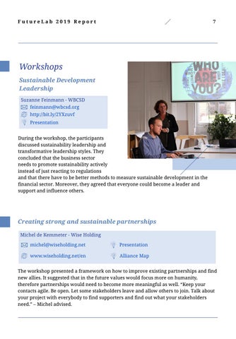 Workshops Sustainable Development Leadership Suzanne Feinmann - WBCSD feinmann@wbcsd.org http://bit.ly/2YXzuvf Presentation During the workshop, the participants discussed sustainability leadership and transformative leadership styles. They concluded that the business sector needs to promote sustainability actively instead of just reacting to regulations and that there have to be better methods to measure sustainable development in the financial sector. Moreover, they agreed that everyone could become a leader and support and influence others.