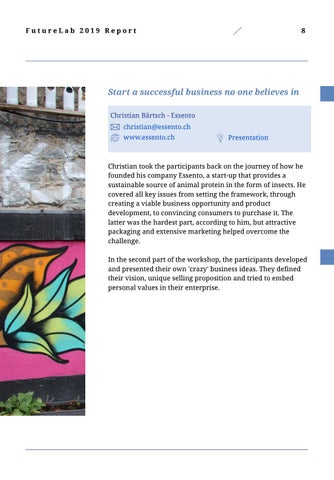 Christian took the participants back on the journey of how he founded his company Essento, a start-up that provides a sustainable source of animal protein in the form of insects. He covered all key issues from setting the framework, through creating a viable business opportunity and product development, to convincing consumers to purchase it. The latter was the hardest part, according to him, but attractive packaging and extensive marketing helped overcome the challenge. In the second part of the workshop, the participants developed and presented their own 'crazy' business ideas. They defined their vision, unique selling proposition and tried to embed personal values in their enterprise.