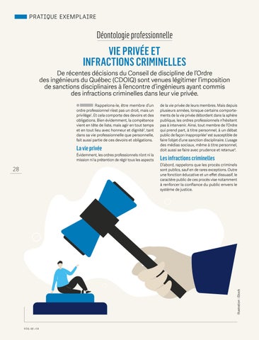 Comme ingénieures et ingénieurs, vous connaissez notre rôle de protection du public et les actions que nous menons pour concrétiser ce e mission — inspection, encadrement déontologique, surveillance de la pratique illégale, etc. Mais au-delà de ces mécanismes que nous appliquons au quotidien, notre mission s’inscrit aussi dans une perspective sociétale qui vise la sécurité et le bien-être de chaque citoyenne et de chaque citoyen, tout en servant les intérêts collectifs. Votre ordre travaille notamment à exercer un leadership sur des enjeux collectifs. Par exemple, l’Ordre a joué un rôle clé dans les consultations entourant le projet de loi 67 pour la modernisation du système professionnel et le projet de loi 76 visant principalement à accroître la qualité de la construction et la sécurité du public. Depuis plusieurs années, nous réclamions l’instauration d’un permis restrictif perme ant aux professionnelles et aux professionnels atypiques d’exercer dans leur domaine de manière permanente. Nous avons constaté avec une grande satisfaction que nos e orts ont porté leurs fruits : le projet de loi 67 incluait ce e mesure qui améliore la souplesse du système professionnel tout en renforçant la protection du public.