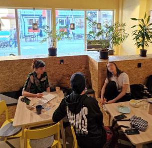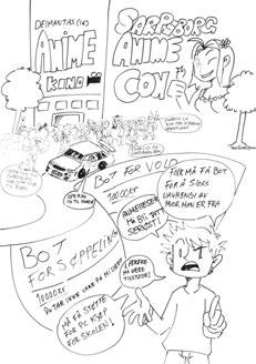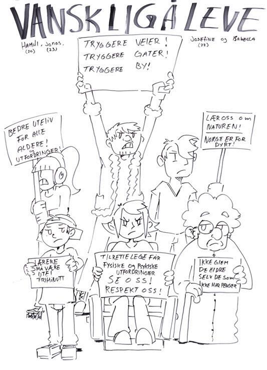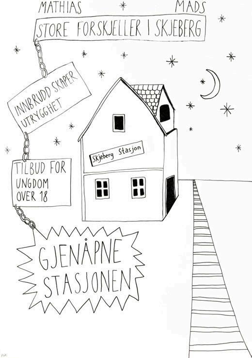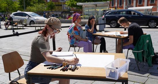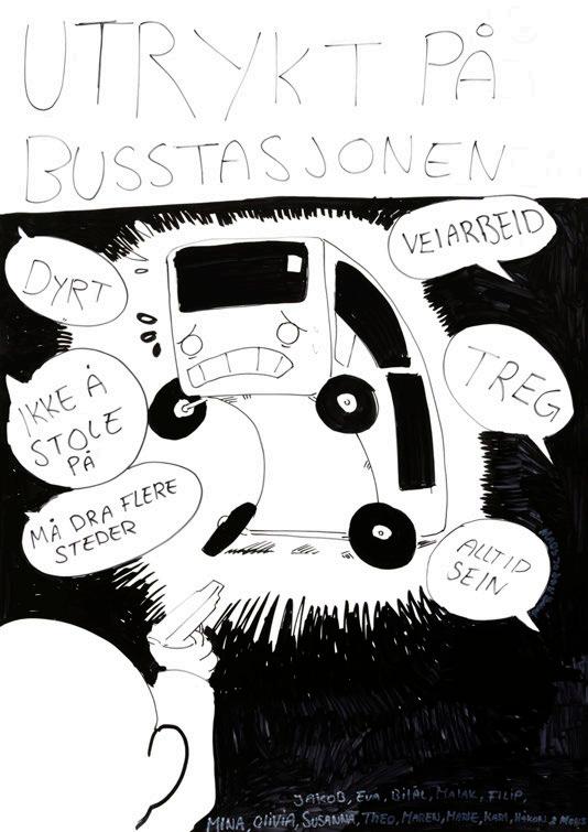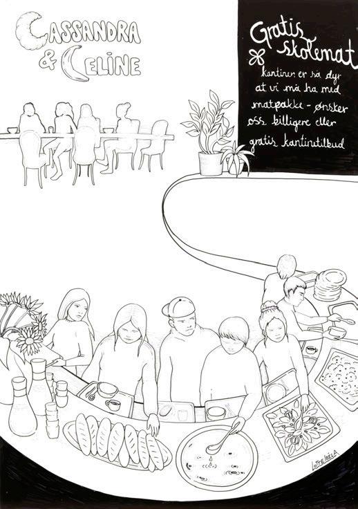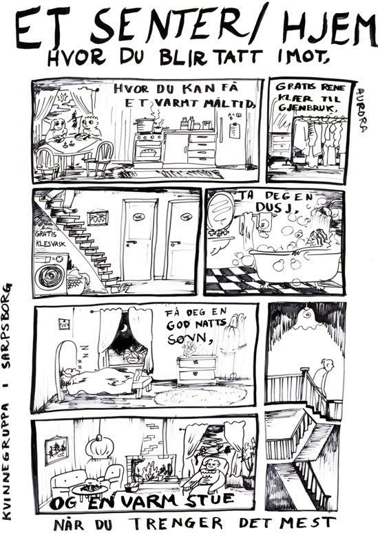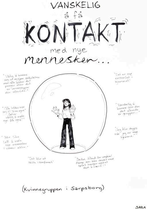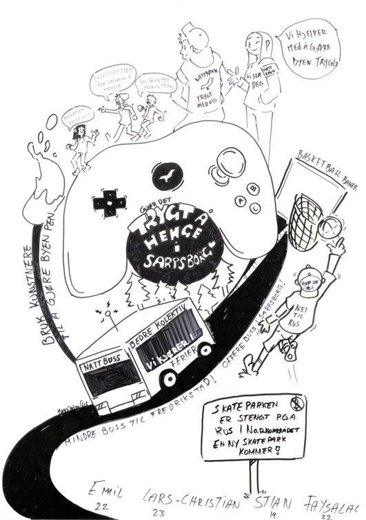 En overraskelse for oss var at vi ble møtt med større skepsis i det offentlige rom i Sarpsborg enn vi har opplevd tidligere (i bl.a. Moss, Drammen, Fredrikstad og Hole). Mange innbyggere vegret seg for en kort samtale med illustratørene. De måtte betrygges om det var gratis eller at deres bidrag ville skje anonymt. Dette viste oss et behov for å tilpasse verket. En invitasjon fra Fellesverket (som er drevet av Røde Kors), kombinert med erfaringene våre fra videregående skoler, ble nøkkelen til en verdifull utvidelse av metodene våre. På Fellesverket stilte vi uten installasjon, kun én illustratør i første omgang, deretter to illustratører i to omganger. Vi måtte bruke mer tid til å skape tillit og et trygt rom, for samtaler som ble preget av ømhet og alvor. Nettopp trygghet ble uttrykt som savnet av mange – særlig ungdommer – i bydelen. Det vi erfarte var dynamiske dialoger som noen ganger avvek fra vår vanlige tidsramme. Dette var likevel viktig for at flere kunne øve på å bruke sin egen stemme. Tone Petronelle Sørlie, som tok initiativet til samarbeidet på vegne av Fellesverket, har skrevet en personlig beretning om sitt møte med kunstverket som du kan lese på side 11–16. Dette anbefales for alle som arbeider med medvirkning og involvering blant ungdommer.