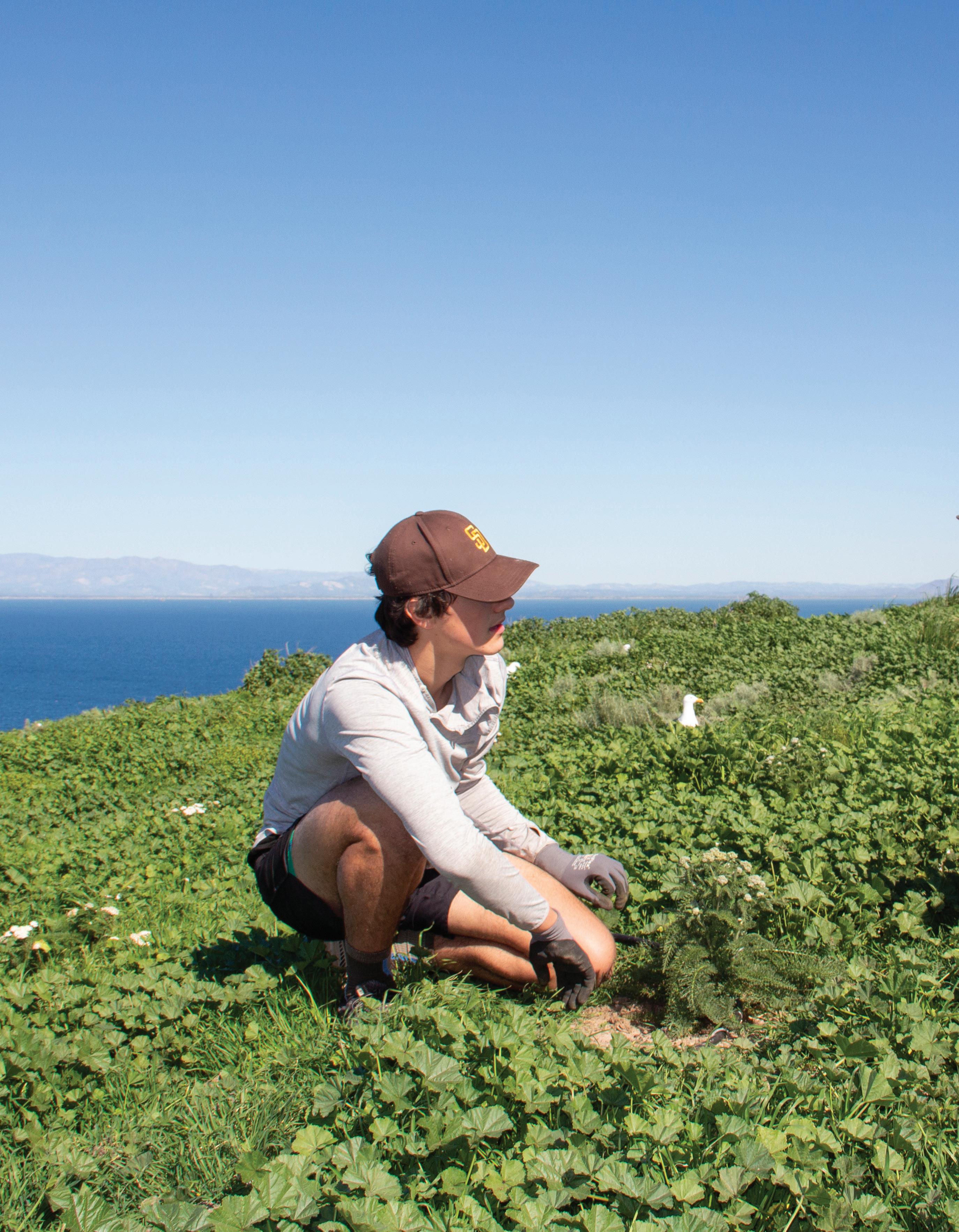 Sophomore Ben Manning (L20) and sixth grader Scotty Hatton pull invasive plants on Anacapa Island.
