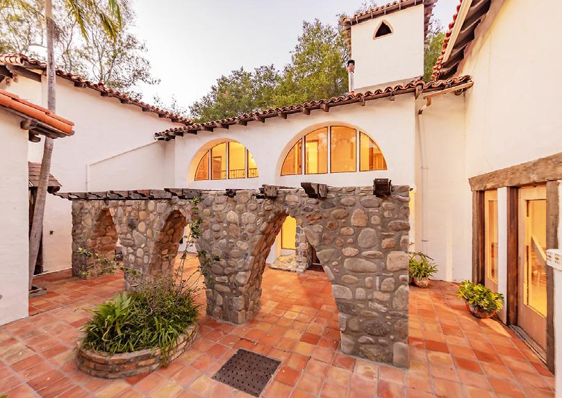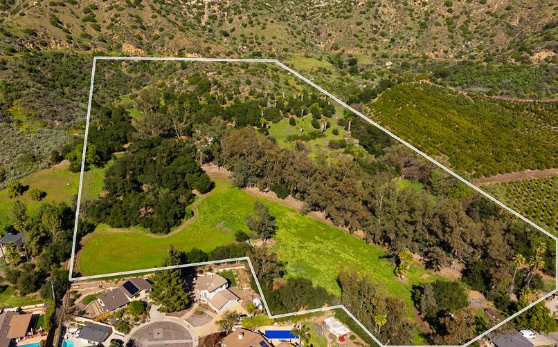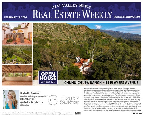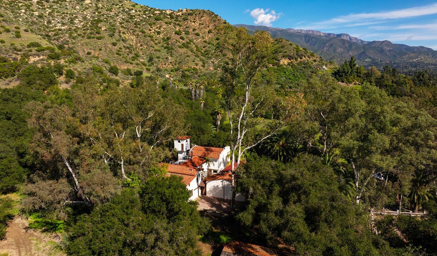 An extraordinary estate spanning 18.34 acres across five legal parcels, privately situated at the end of a quiet cul-de-sac with a graceful eucalyptuslined drive. Two beautiful one-acre residential parcels on the lower grounds present an opportunity for development. From the upper ranch enjoy direct access to the beloved Shelf Road Trailhead with miles of scenic foothill hiking. The 3,658sqft. Spanish Revival home is rich in architectural character. Locally sourced materials include Big Sur jade fireplaces, Ojai-grown Chinese elm flooring & cabinetry, and handcrafted RTK tile at the entry & stairway. Each of the four upstairs bedrooms opens to its own deck overlooking the oak grove. Updates include newer appliances, copper plumbing, updated electrical, remodeled bathrooms (including an ADA-accessible bath) & custom ironwork.
