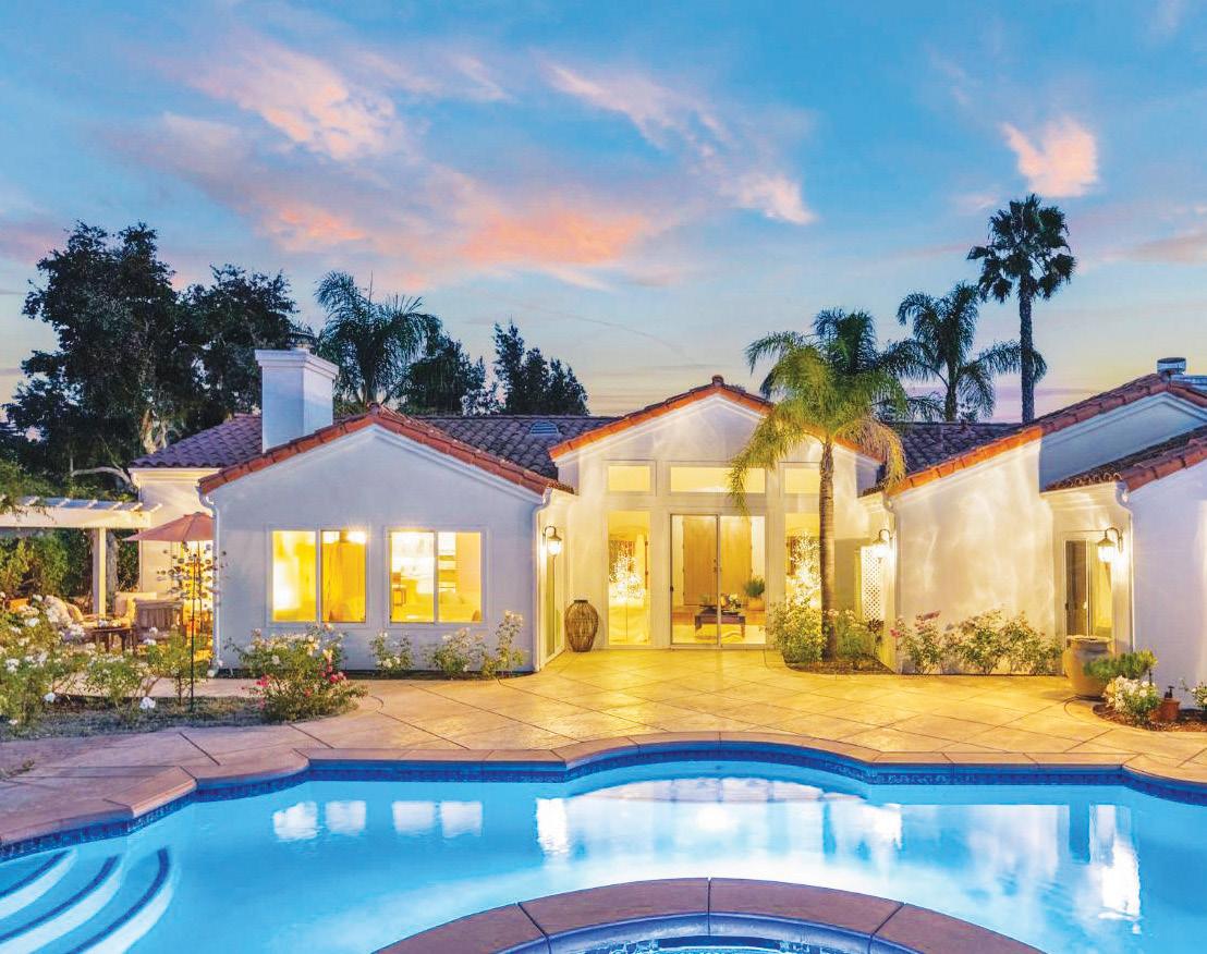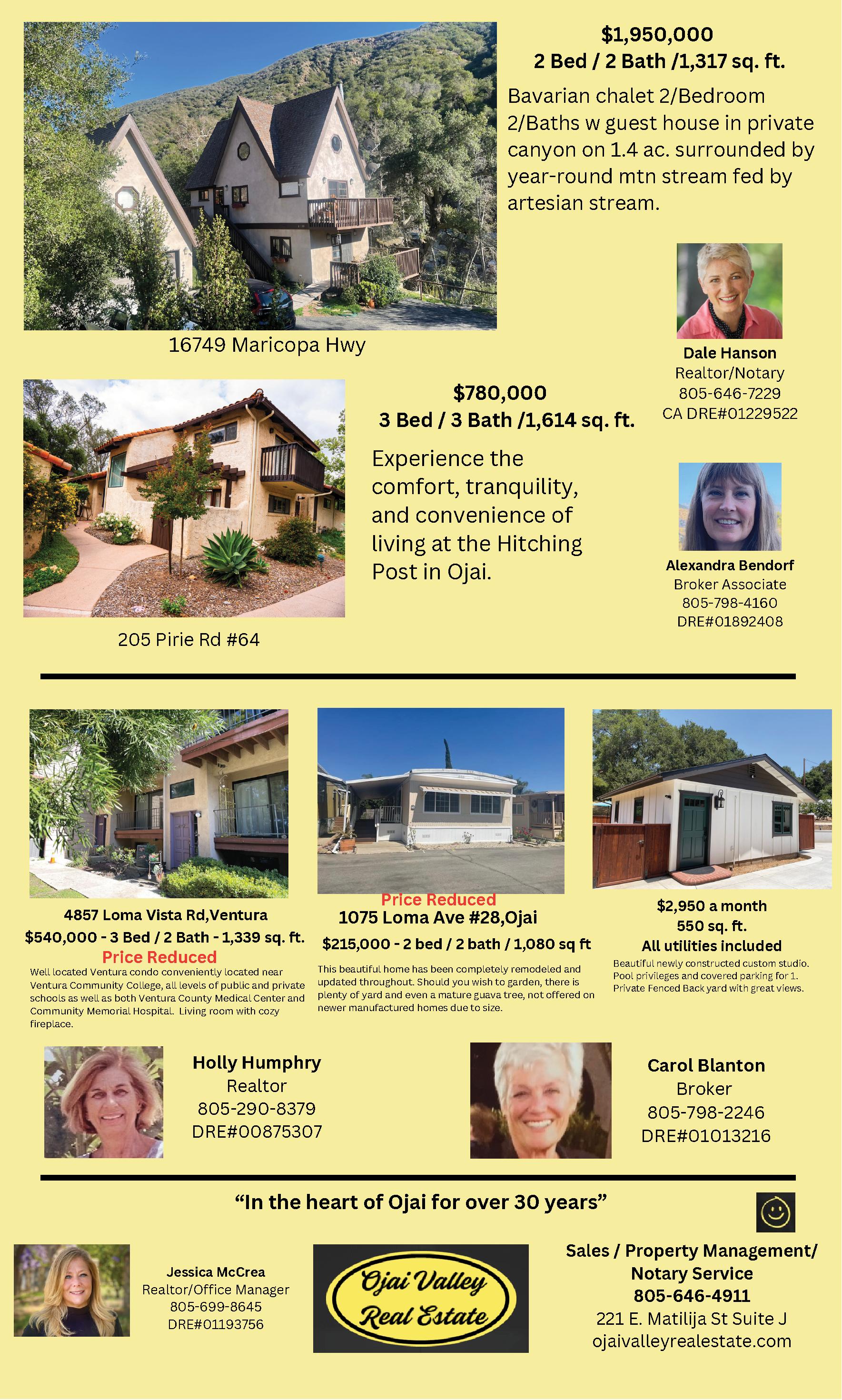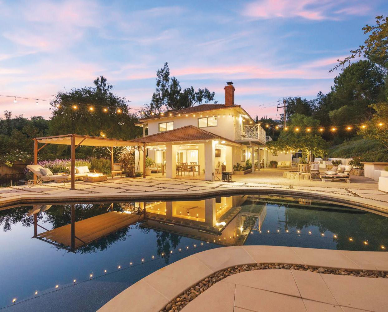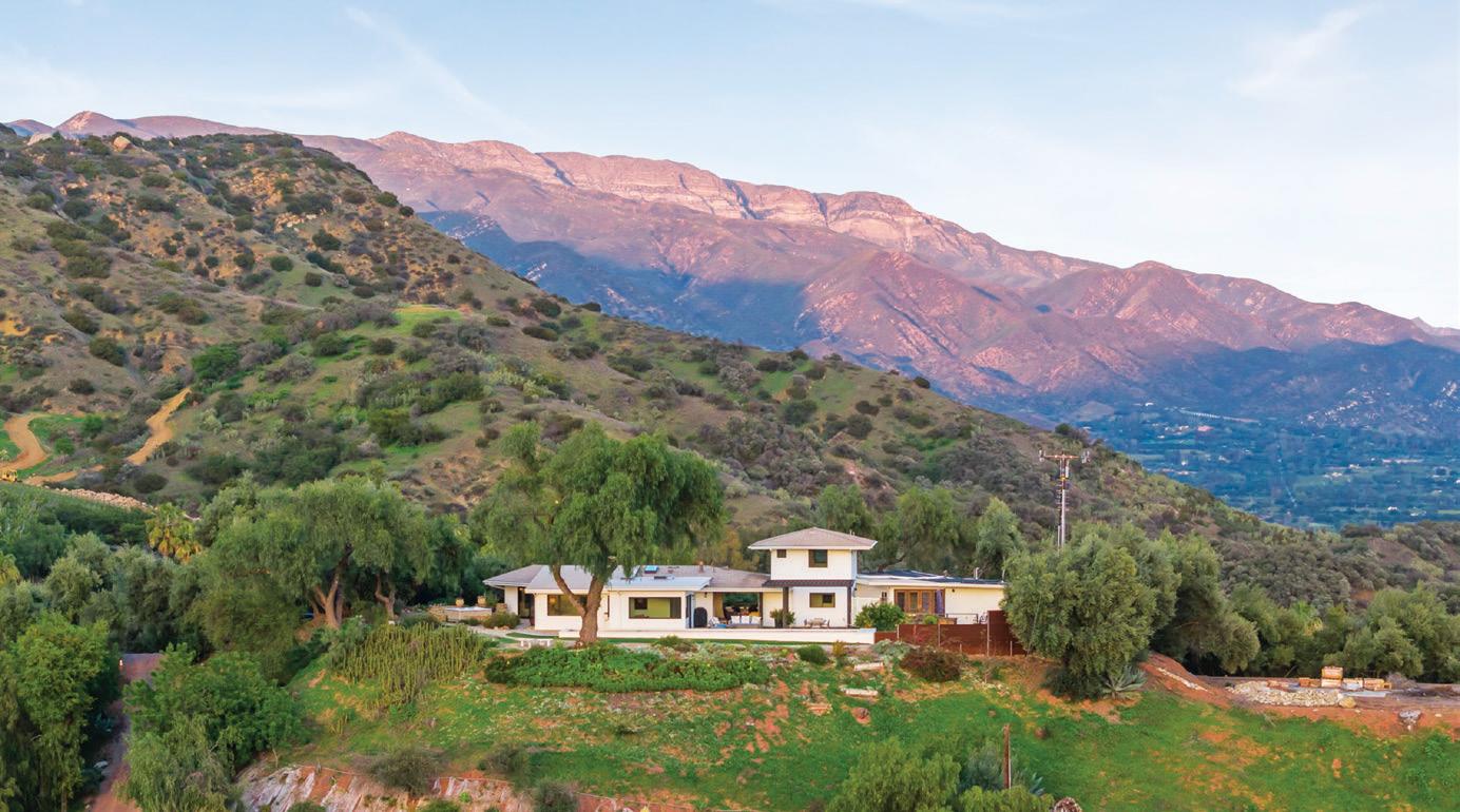 This hillside estate offers stunning views of the Topa Topa Mountains & the famous Pink Moment. The wide open, single story floor plan encompasses the living/dining room, kitchen & media room, which opens to the back yard with sauna. Preparing meals is a dream when you have jaw-dropping valley & mountain views in one direction & the lush, green side yard in the other. High-end appliances like the six-burner Wolf stove & Meile dishwasher make for great meals & easy cleanup. The large laundry room features plenty of built-ins, washer/ dryer, & wine fridge. Four comfortable bedrooms include the primary with cozy fireplace designed by RTK Studios & a relaxing spa bath. There’s also an office space with separate entrance & large storage room. The airy guest house has soaring wood ceilings, sliding glass doors, clerestory windows, a Murphy bed with builtin bookcases, large living area, & beautiful bath with granite countertop & roomy shower. If you’d like to turn it into an ADU, you can easily add a kitchen & lease it out for great additional income. This property really has it all.