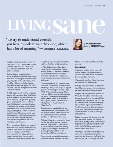 aubrey balkind knows how to use an artfully designed threeletter word and a question mark to jolt people out of complacency. Before Balkind moved to Ojai in 2014, he was an influential advertising executive and designer from New York City. Founder of the advertising firm Frankfurt Balkind, he helped design Time Warner’s annual report for 1989, the year Time Inc. merged with Warner Communications. The 60-page report which won design awards and merited a New York Times article, broke all the graphics rules. Its cover featured a bright ’80s glowing green background, printed with six colorful abstract rectangular images of a globe, lips, an eye, an ear, a bald head and a hand. In the middle of the page was the phrase “WHY?” in black capital letters. The design inside was daring as well, resulting in a magazinelike publication that shareholders probably actually read vs. the usual staid corporate missive. Thirty years later, Balkind has created an equally bold design, again featuring short all-caps words and a question mark, to make a point. But this time his goal is to help people live saner, healthier lives through selfhealing, reconnecting to nature, and