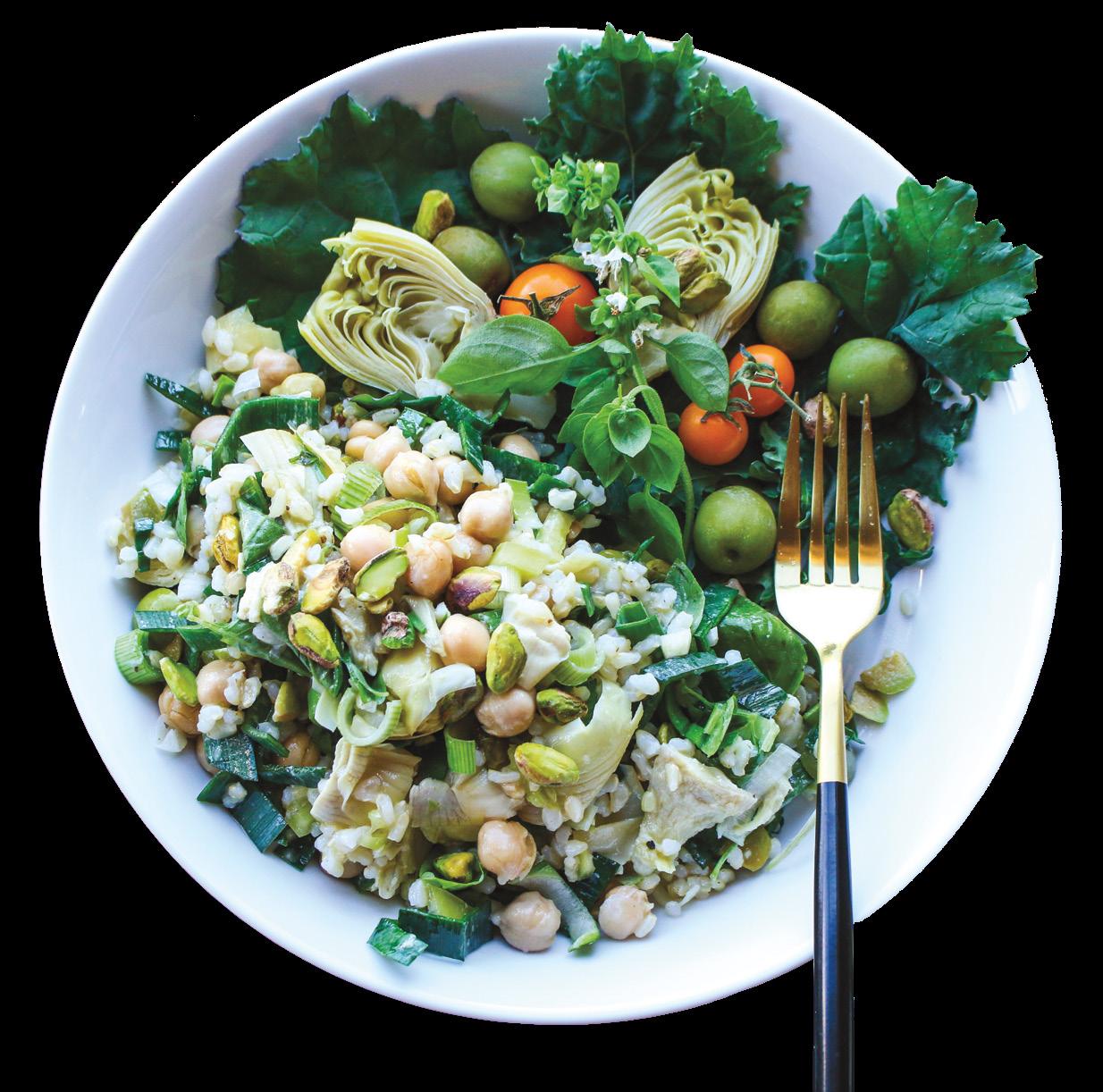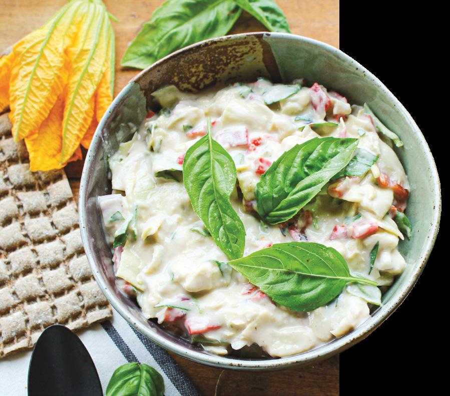 Place rinsed, thoroughly drained white beans in a food processor container or blender. Add lemon juice, zest, garlic, nutritional yeast, and black pepper. Blend while adding olive oil and, if needed, enough reserved artichoke liquid to make a very thick texture (the mixture will loosen when other ingredients are added, so only add enough liquid to make a thick texture). Stop to scrape down sides if needed. Transfer the white bean mixture to the mixing bowl with artichokes.
