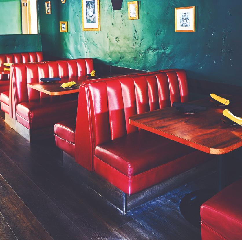 Every element tells a story. “The art Saw did on the wall is so him, and the Southeast Asian twist in his barbecue reflects his roots,” Brittany explains. “We painted the walls green to match our first apartment; the yellow room is a nod to our wedding cake, the red chairs [a nod] to my red wedding dress. Joplin’s is our life in restaurant form.”