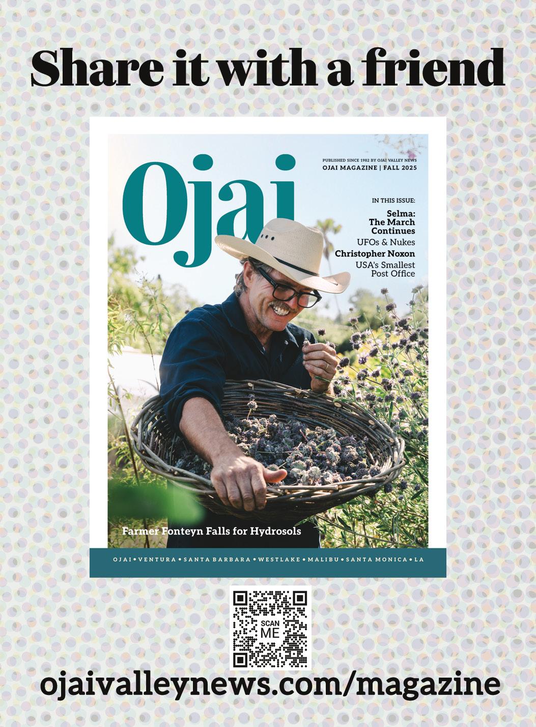 As the United States begins our semiquincentennial year, we are questioning everything we believed in — our heroes, our enemies, our institutions, and our sources of information. We must never give up on liberty, but bingeing on global and national politics can cost us our souls’ rest. We exhaust ourselves from shaking our fists at the current administration, the deep state, and the corporate global puppet masters … come back home, and let’s change the things we can. There is both meaning and solace to be found in embracing our small world — the place where we live — where we can effect preservation and make positive change in our breathtakingly gorgeous spring-green Ojai Valley.