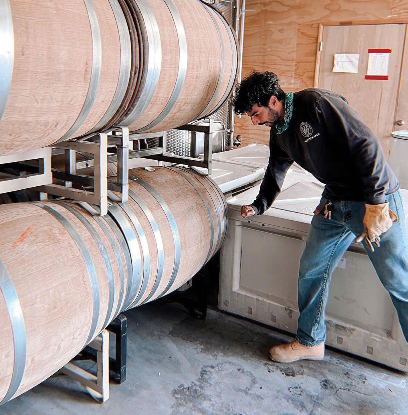 “People just think I’m wearing an ascot and swirling a glass,” Sam tells me. “The harvest is the busiest time and it’s a grind. It’s 24/7 for almost three months. The fruits are coming in. It’s extremely physical. You’re moving things around on a forklift; you’re scrubbing out fermenters; and you’re hoisting barrels that can weigh up to 150