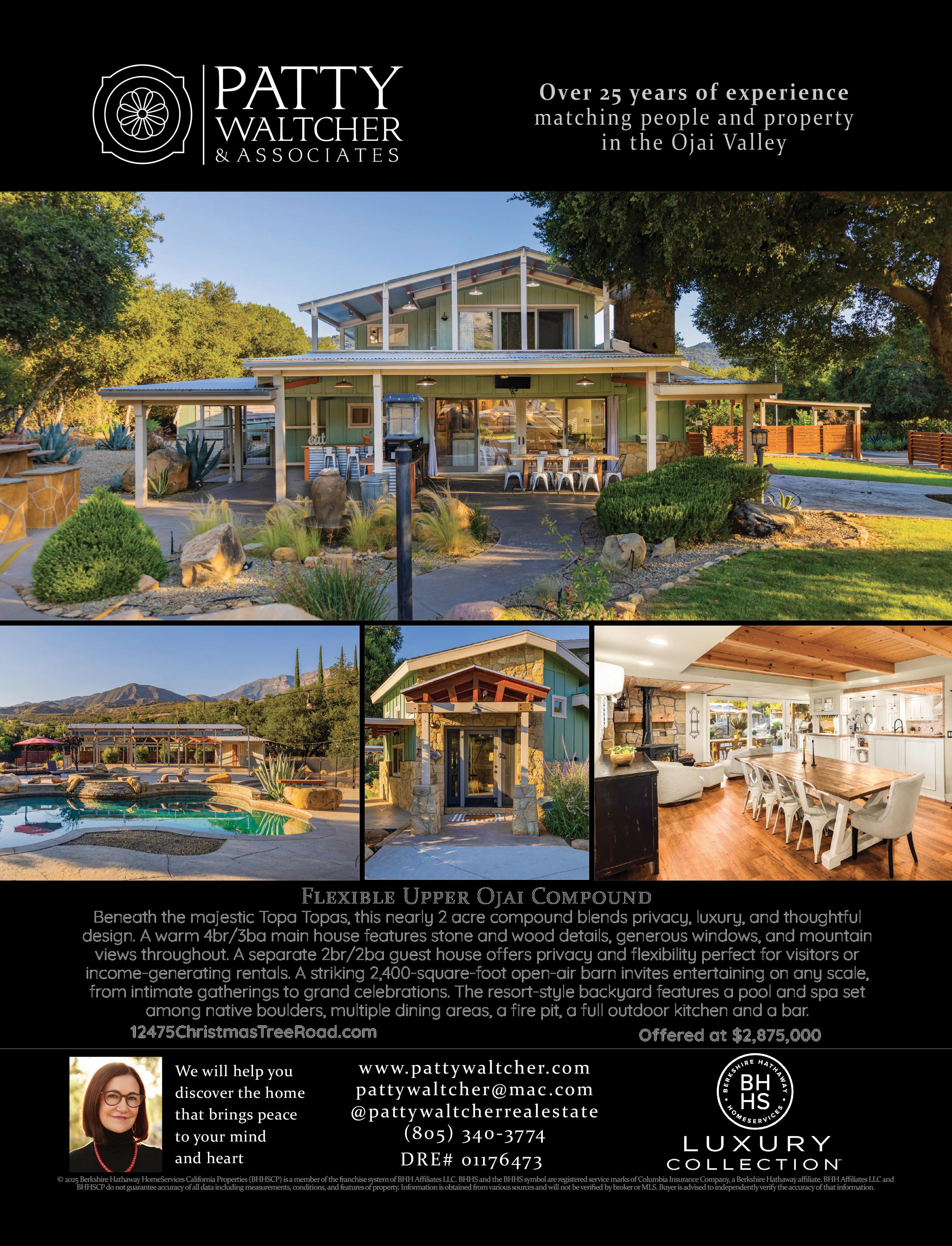 Set along O jai’s coveted Foothill Road, this restored 1929 Tudor Revival estate blends historic charm with modern elegance. A designated Historic Landmark, the proper ty features a 4-bed main house, barn, yoga studio, and enchanting gardens with mountain views. Moments f rom hiking trails, farmers markets, and the O jai Valley Inn, it’s a rare chance to own a piece of O jai histor y.