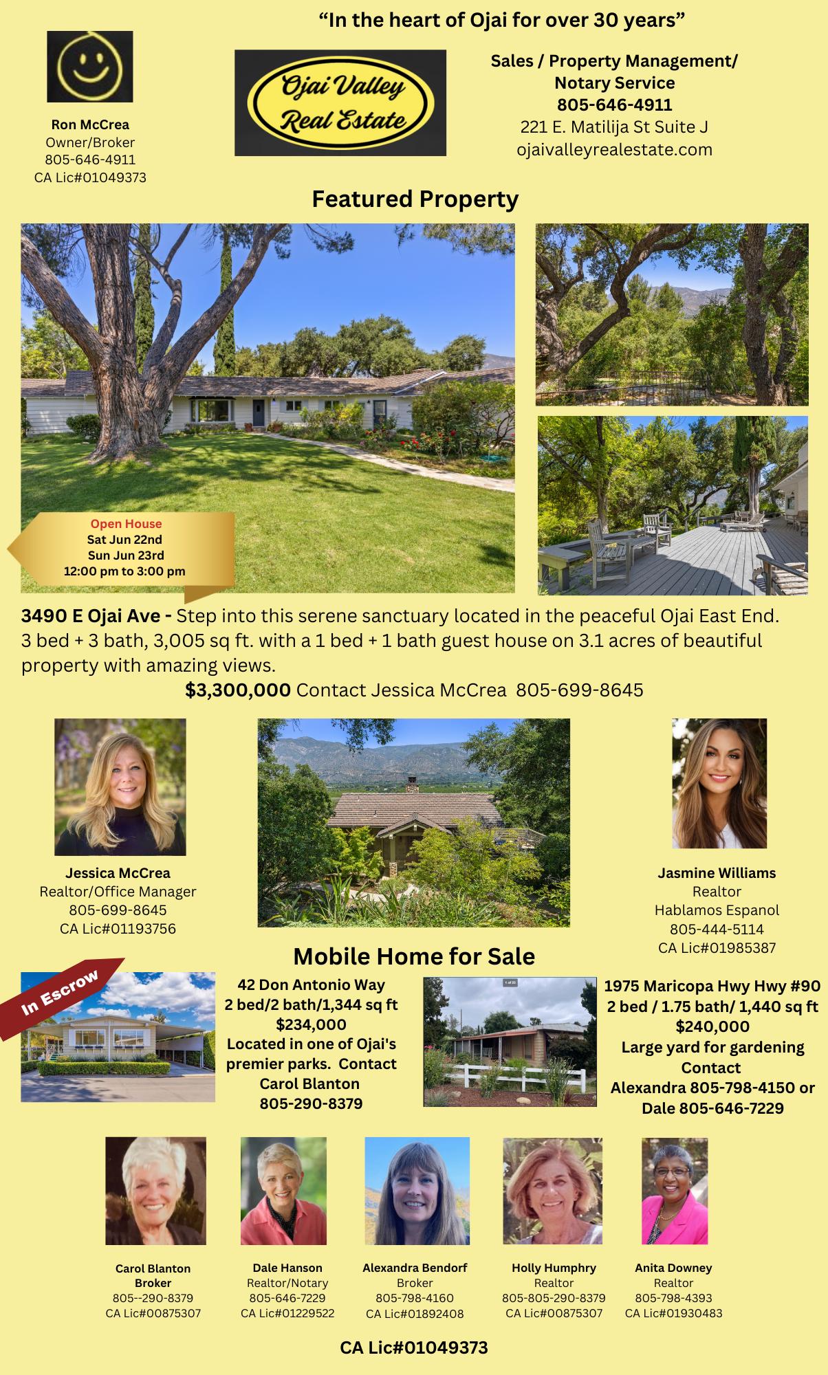 JUNE 21ST, 2024 Make an impression with 50,000 users per monthadvertise in Ojai’s only weekly print + digital Real Estate publication. Check out Ojai’s weekly Open House list. Shop for your Ojai nest in print, online, or from our Mobile News App; Published by Ojai’s local independent news media -www.ojaivalleynews.com Ojai Valley News 805-646-1476 www.ojaivalleynews.com CONTACT: RE@OJAIVALLEYNEWS.COM