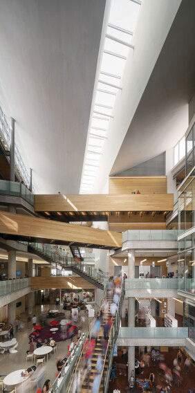 The design beautifully balances the acousical requirements for quiet reading spaces and collaborative spaces within the library. This balance is manifested in the treatment of the walls as well as spatial zoning to control noise levels.