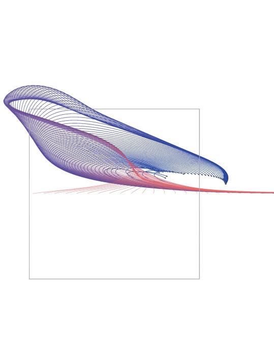 The starting position is constrained to a line in this iteration and the paths are recorded using the trails. Different local values are iterated to observe the various behaviors.