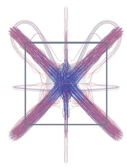The final exploration involves the use of mesh vertices as starting points for the agents. The mesh is placed at the center of the boundary and the agent trails create unique combinations and patterns while reaching for the boundary