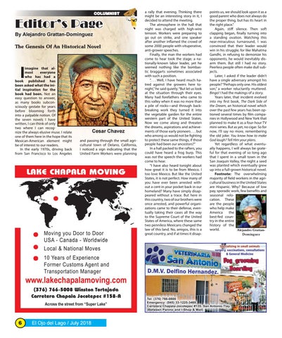 a rally that evening. Thinking there might be an interesting story in it, I decided to attend the meeting. The atmosphere in the hall that night was charged with high-wire tension. Workers were preparing to go out on strike, and one speaker after another inflamed the crowd of some 2000 people with vituperative, anti-grower speeches. Finally, the man the workers had come to hear took the stage; a nationally-known labor leader, yet he seemed nothing like the bombastic braggarts sometimes associated with such a position. “. . . Well, I have heard much hatred against the growers here tonight,” he said quietly. “But let us look at the situation through their eyes. Many had forefathers who came to this valley when it was no more than a pile of rocks—and through backbreaking work they turned it into the vegetable garden for the entire western part of the United States. Now we come along and threaten the dreams, aspirations and achievements of those early pioneers . . . but who among us would not be fighting to protect these same things, if those people had been our ancestors?” In a hall packed to the rafters, you could have heard a frog burp. This was not the speech the workers had come to hear. “I have also heard tonight about how great it is to be from Mexico. I too love Mexico. But like the United States, it is not perfect. How many of you have ever been arrested without a cent in your pocket back in our homeland? Many have simply disappeared without a trace. But here in this country, two of our brothers were once arrested, and powerful organizations came to their defense, eventually taking their cases all the way to the Supreme Court of the United States of America, where these same two penniless Mexicans changed the law of this land. No, amigos, this is a great country, and if at times it disap-