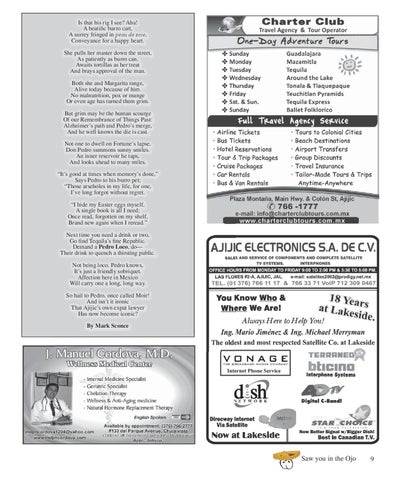 Is that his rig I see? Aha! A beatific burro cart, A surrey fringed in peau de soie, Conveyance for a happy heart. She pulls her master down the street, As patiently as burro can, Awaits tortillas as her treat And brays approval of the man. Both she and Margarita range, Alive today because of him. No malnutrition, pox or mange Or even age has turned them grim. But grim may be the human scourge Of our Remembrance of Things Past: Alzheimer’s path and Pedro’s merge, And he well knows the die is cast. Not one to dwell on Fortune’s lapse, Don Pedro summons sunny smiles. An inner reservoir he taps, And looks ahead to many miles. “It’s good at times when memory’s done,” Says Pedro to his burro pet; “Those arseholes in my life, for one, I’ve long forgot without regret. “I hide my Easter eggs myself, A single book is all I need; Once read, forgotten on my shelf, Brand new again when I reread.” Next time you need a drink or two, Go find Tequila’s fine Republic. Demand a Pedro Loco, do— Their drink to quench a thirsting public. Not being loco, Pedro knows, It’s just a friendly sobriquet. Affection here in Mexico Will carry one a long, long way. So hail to Pedro, once called Moir! And isn’t it ironic That Ajijic’s own expat lawyer Has now become iconic? By Mark Sconce