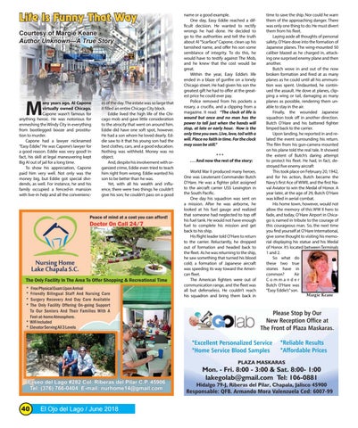 time to save the ship. Nor could he warn them of the approaching danger. There was only one thing to do. He must divert them from his fleet. Laying aside all thoughts of personal safety, O’Hare dove into the formation of Japanese planes. The wing-mounted 50 caliber blazed as he charged in, attacking one surprised enemy plane and then another. Butch wove in and out of the now broken formation and fired at as many planes as he could until all his ammunition was spent. Undaunted, he continued the assault. He dove at planes, clipping a wing or tail, damaging as many planes as possible, rendering them unable to stay in the air. Finally, the wounded Japanese squadron took off in another direction. Butch O’Hare and his battered fighter limped back to the carrier. Upon landing, he reported in and related the event surrounding his return. The film from his gun-camera mounted on his plane told the real tale. It showed the extent of Butch’s daring attempt to protect his fleet. He had, in fact, destroyed five enemy aircraft This took place on February 20, 1942, and for his action, Butch became the Navy’s first Ace of WWII, and the first Naval Aviator to win the Medal of Honor. A year later, at the age of 29, Butch O’Hare was killed in aerial combat. His home town, however, would not allow the memory of this WW II hero to fade, and today, O’Hare Airport in Chicago is named in tribute to the courage of this courageous man. So, the next time you find yourself at O’Hare International, give some thought to visiting his memorial displaying his statue and his Medal of Honor. It’s located between Terminals 1 and 2. So what do these two true stories have in common? Air Commander Butch O’Hare was “Easy Eddie’s” son. Margie Keane