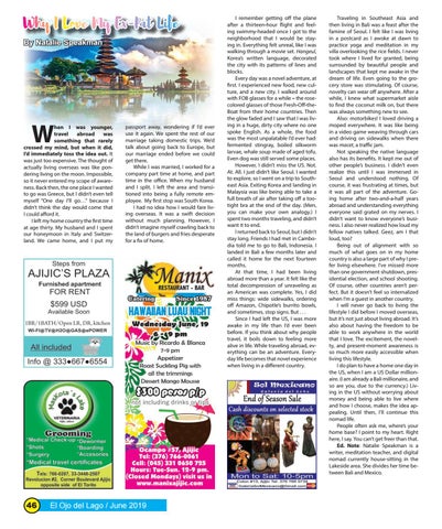 I remember getting off the plane after a thirteen-hour flight and feeling swimmy-headed once I got to the neighborhood that I would be staying in. Everything felt unreal, like I was walking through a movie set. Hangeul, Korea’s written language, decorated the city with its patterns of lines and blocks. Every day was a novel adventure, at first. I experienced new food, new culture, and a new city. I walked around with FOB glasses for a while – the rosecolored glasses of those Fresh-Off-theBoat from their home countries. Then the glow faded and I saw that I was living in a huge, dirty city where no one spoke English. As a whole, the food was the most unpalatable I’d ever had: fermented stingray, boiled silkworm larvae, whale soup made of aged tofu. Even dog was still served some places. However, I didn’t miss the US. Not. At. All. I just didn’t like Seoul. I wanted to explore, so I went on a trip to Southeast Asia. Exiting Korea and landing in Malaysia was like being able to take a full breath of air after taking off a tootight bra at the end of the day. (Men, you can make your own analogy.) I spent two months traveling, and didn’t want it to end. I returned back to Seoul, but I didn’t stay long. Friends I had met in Cambodia told me to go to Bali, Indonesia. I landed in Bali a few months later and called it home for the next fourteen months. At that time, I had been living abroad more than a year. It felt like the total decompression of unraveling as an American was complete. Yes, I did miss things: wide sidewalks, ordering off Amazon, Chipotle’s burrito bowls, and sometimes, stop signs. But . . . Since I had left the US, I was more awake in my life than I’d ever been before. If you think about why people travel, it boils down to feeling more alive in life. While traveling abroad, everything can be an adventure. Everyday life becomes that novel experience when living in a different country.