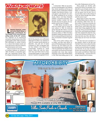 ent. In December 1896, he was introduced to photographer Fred Holland Day, whose reputation at the turn of the last century rivaled that of Alfred Stieglitz. Day declared Gibran a “natural geniusâ€? and became his mentor. While exhibiting his art at Day’s studio, Gibran met Mary Elizabeth Haskell, a prominent educator, who became another mentor—for two decades she was his patron, his supporter, and his tutor in English. In 1898, Gibran returned to Lebanon for several years to study his own culture. In 1902, he returned, going through Ellis Island a second time‌although he never became an American citizen. In 1908-1910, Mary Elizabeth Haskell provided funds for him to study painting and drawing in Paris. His teachers included Auguste Rodin. Most of his earlier writings were in Arabic, and they were about aspects of Christianity, particularly spiritual love. By 1918, Gibran was writing and publishing in English and in 1923 he published The Prophet. It has never gone out of print and has been translated into more than twenty languages. Some claim Khalil Gibran is the third best-selling poet of all