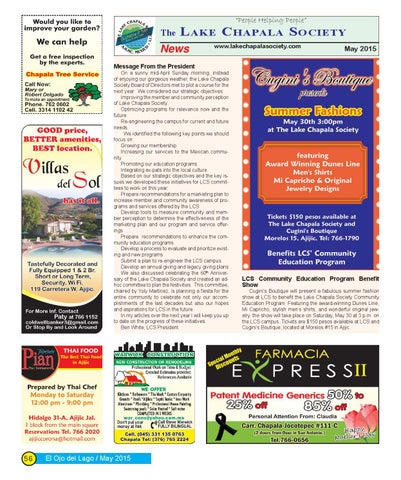 Message From the President On a sunny mid-April Sunday morning, instead of enjoying our gorgeous weather, the Lake Chapala Society Board of Directors met to plot a course for the next year. We considered our strategic objectives: Improving the member and community perception of Lake Chapala Society Optimizing programs for relevance now and the future Re-engineering the campus for current and future needs :H LGHQWLÂżHG WKH IROORZLQJ NH\ SRLQWV ZH VKRXOG focus on: Growing our membership Increasing our services to the Mexican community Promoting our education programs Integrating ex-pats into the local culture. Based on our strategic objectives and the key issues we developed these initiatives for LCS committees to work on this year: Prepare recommendations for a marketing plan to increase member and community awareness of programs and services offered by the LCS Develop tools to measure community and member perception to determine the effectiveness of the marketing plan and our program and service offerings Prepare recommendations to enhance the community education programs Develop a process to evaluate and prioritize existing and new programs Submit a plan to re-engineer the LCS campus Develop an annual giving and legacy giving plans We also discussed celebrating the 60th Anniversary of the Lake Chapala Society and created an adhoc committee to plan the festivities. This committee, FKDLUHG E\ <RO\ 0DUWLQH] LV SODQQLQJ D ÂżHVWD IRU WKH entire community to celebrate not only our accomplishments of the last decades but also our hopes and aspirations for LCS in the future. In my articles over the next year I will keep you up to date on the progress of these initiatives. Ben White, LCS President