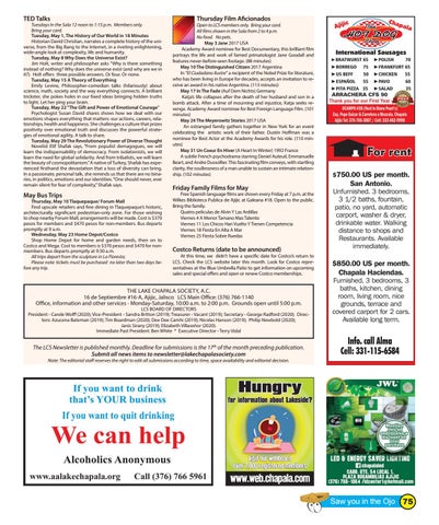 Thursday, May 10 Tlaquepaque/ Forum Mall Find upscale retailers and fine dining in Tlaquepaque’s historic, architecturally significant pedestrian-only zone. For those wishing to shop nearby Forum Mall, arrangements will be made. Cost is $370 pesos for members and $470 pesos for non-members. Bus departs promptly at 9 a.m. Wednesday, May 23 Home Depot/Costco Shop Home Depot for home and garden needs, then on to Costco and Mega. Cost to members is $370 pesos and $470 for nonmembers. Bus departs promptly at 9:30 a.m. All trips depart from the sculpture in La Floresta; Please note: tickets must be purchased no later than two days before any trip.