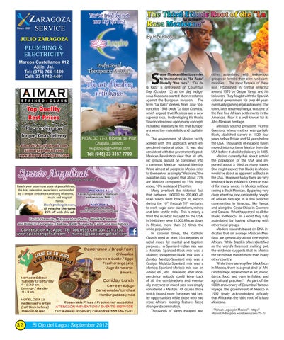 either assimilated with indigenous groups or formed their own rural communities. The most famous of these was established in central Veracruz around 1570 by Gaspar Yanga and his followers. They fought with the Spanish colonial government for over 40 years eventually gaining legal autonomy. The town, later renamed Yanga, was one of the first free African settlements in the Americas. Now it is well-known for its Afro-Mexican heritage. Mexico’s second president, Vicente Guerrero, whose mother was partially Black, abolished slavery in 1829, four years before Britain and 34 years before the USA. Thousands of escaped slaves moved into northern Mexico from the USA before it abolished slavery in 1865. Mexico currently has about a third the population of the USA and imported about a third as many slaves. One might expect that Blacks in Mexico would be about as apparent as Blacks in the USA. However, today there are very few black faces in Mexico. One can travel for many weeks in Mexico without seeing a Black Mexican. By paying very close attention, one can identify people of African heritage in a few selected communities in Veracruz, like Yanga, and along the Costa Chica in Guerrero and Oaxaca. What happened to all the Blacks in Mexico? In a word they fully assimilated by having offspring with other racial groups. Modern research based on DNA indicates that on average Mexican Mestizos are genetically about one-eighth African. While Brazil is often identified as the world’s foremost melting pot, the evidence suggests that in Mexico the races have melted more than in any other country. While there are very few black faces in Mexico, there is a great deal of African heritage represented in art, music, dance, food, and even in fishing and agricultural practices1. As part of the 500th anniversary of Columbus’ famous voyage, the government of Mexico in 1992 finally acknowledged officially that Africa was the “third root” of la Raza Mexicana. 1 “Africa’s Legacy in Mexico” : http:// afrosistahdiaspora.wordpress.com/75-2/