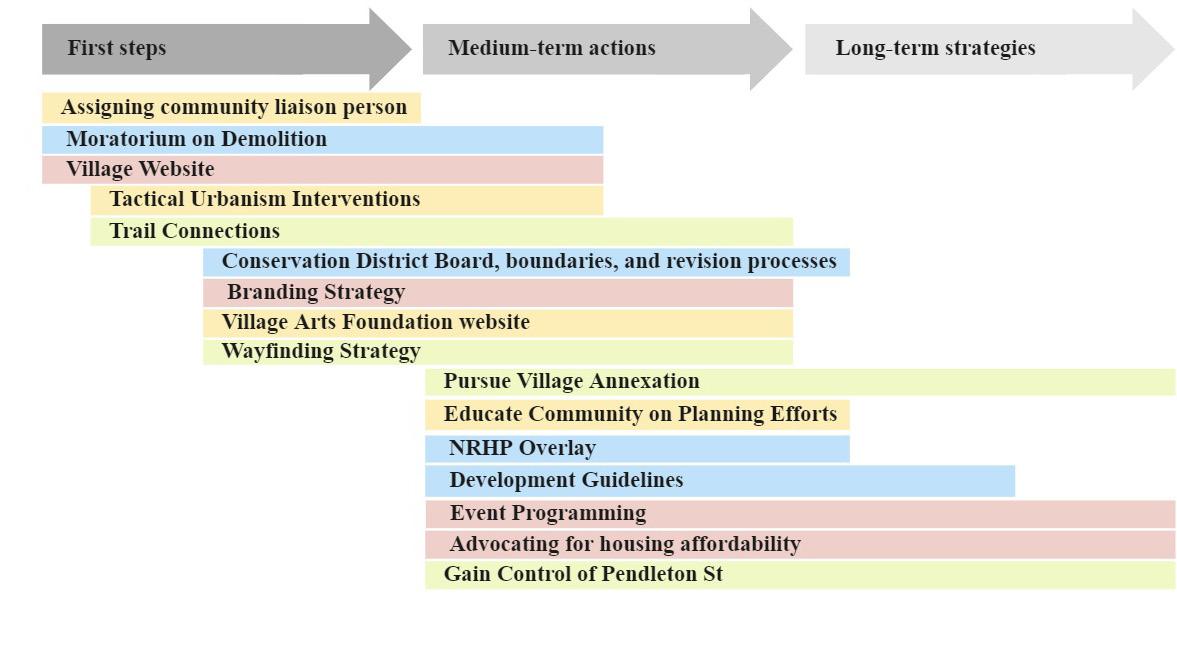Actions needed from the city and the respective resources are either administrative (i.e. annexation, conservation district, NHRP overlay, and Pendleton street management), coordination such as facilitating the establishment of the responsible Village organizations and addressing the political issues and media, and community planning like the websites, tactical urbanism, and signage strategy. The short-term steps include community outreach with the media and above mentioned communities’ support. Building relationships will take time and can form along with inventorying and promoting the local groups and initiatives. Starting a discussion on the Village boundaries and feasible stages of annexation are also needed from the beginning.