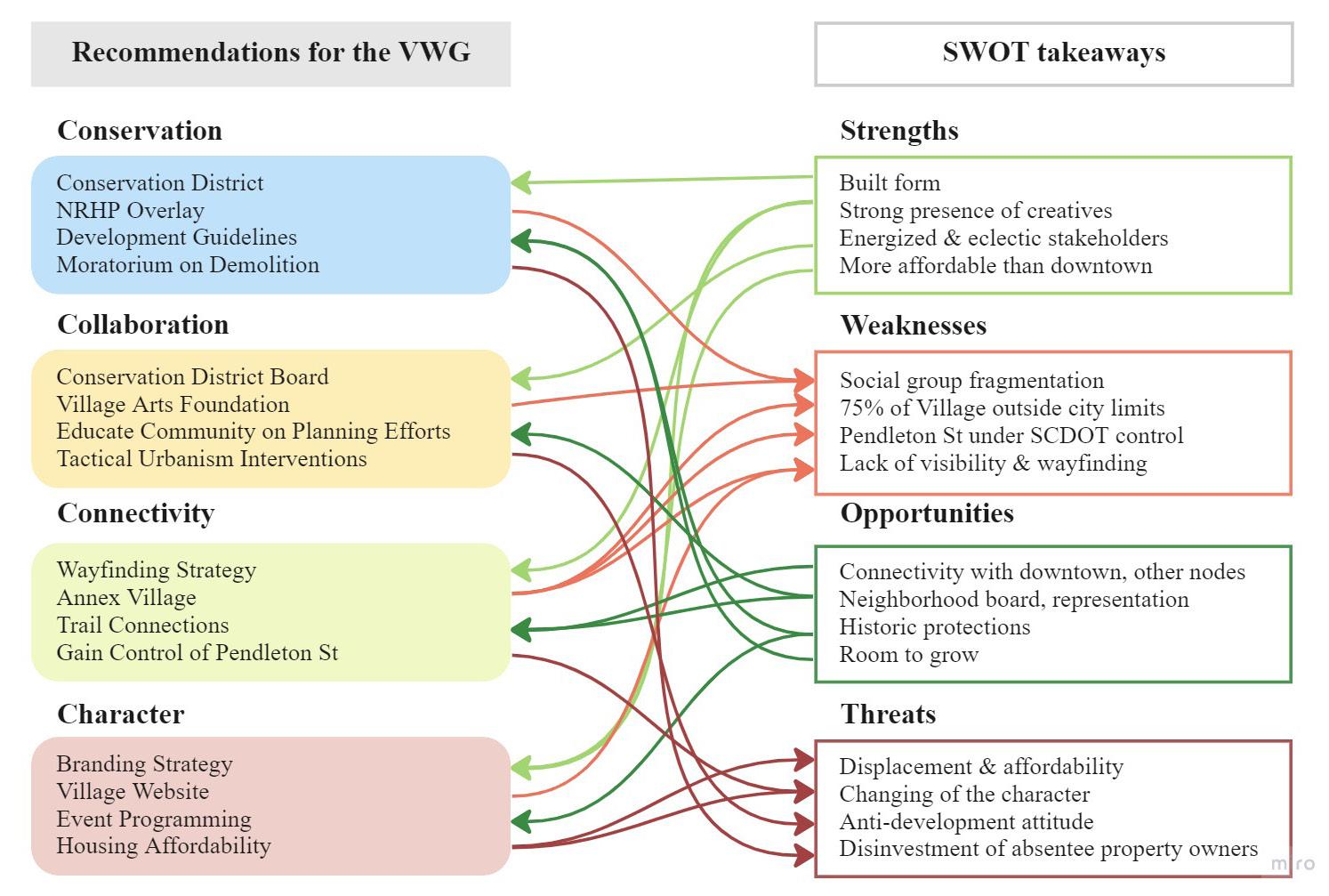 ȑ The recommendations we propose for the Village of West Greenville are focused on providing a framework to develop the Village as a vibrant art district grounded in the diverse and eclectic historical context. We structured this goal into four concepts and focused each on a specific resource and barrier to overcome. Conservation, Collaboration, Connectivity, and Character concepts result from the comprehensive analysis we primarily conducted. While working on the study, the main SWOTs we identified specified directions to guide the proposal and its actions so that the city of Greenville has a clear idea of how to apply recommendations.