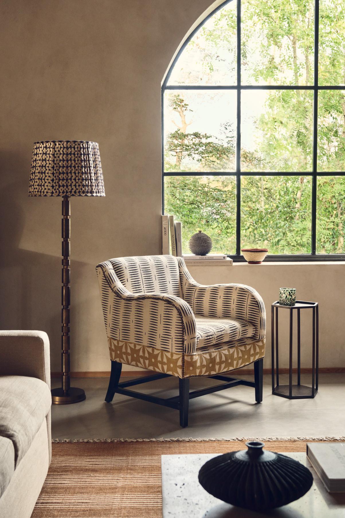 Perfection Covered in a handwoven cotton dhurrie, the Nomeko Armchair encapsulates our love of eyecatching upholstery. Jameo Floor Lamp $495 (seen with Romneya Shade Dark Blue $260) Nomeko Armchair $1,995 Acanthosphere Lidded Pot $65 Pair of Kaia Woven Bowls $65 Shida Side Table $395 Pair of Nura Candle Holders Emerald/Mint $50 Symbology Rug $895 4