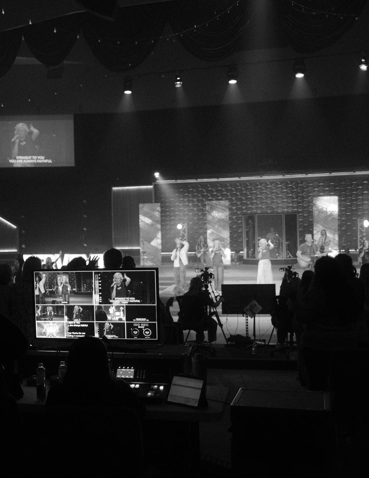 At first, we pieced together a typical worship team. Some in the group were scared to be in a room with other people. We set up in the main auditorium as if a crowd had come to worship with us. We recorded three songs backto-back, did a basic mix-in post, and then sent it and our footage to our editor, who added it to our Sunday service for that weekend.