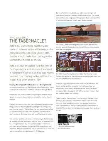 Dining Center The NEXT major facility to come will be The Worship Center. Perhaps this would be the appropriate moment to ask, have you become a NEXT Generation Partner? Financial support has never been more vital than today! The dream is alive and the project is moving forward but we desperately await every Oklahoma church, every Oklahoma minister, and the thousands of NEXT Generation Partners that will turn the dream into a reality. Please pray for the continued construction of the new camp and if you have made a commitment please fulfill that commitment. Also, would you remind your people to continue their commitments? If they have not made a commitment to be a NEXT Generation Partner, please encourage them to do so TODAY!