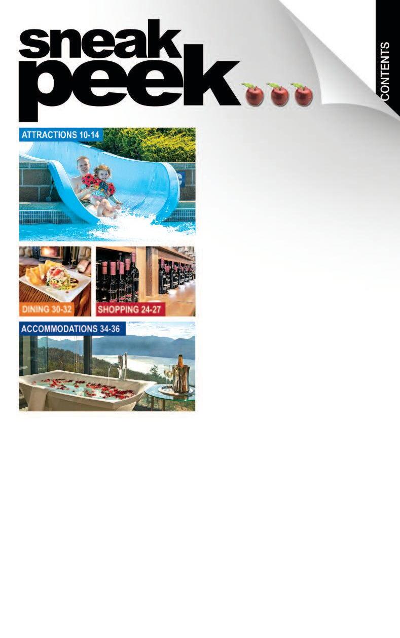WHAT’S INSIDE Welcome to Communities 6-9 Accommodations 34-36 Attractions 10-15 Dining 30-32 Golf 18-19 Health, Beauty 33 Art and Histor y 15 Real Estate 22 Ser vices 23 Shopping 24-27 Wineries 20-21 Photos:Splashdown•Alexander’sBeachPub OliveUs•SparklingHillResort © 2 0 2 3 O k a n a g a n M a p G u i d e s L t d Reproduction in whole or in part without the written consent from the publisher is prohibited Okanagan Map Guides cannot be held responsible for errors or omissions in the material contained herein
