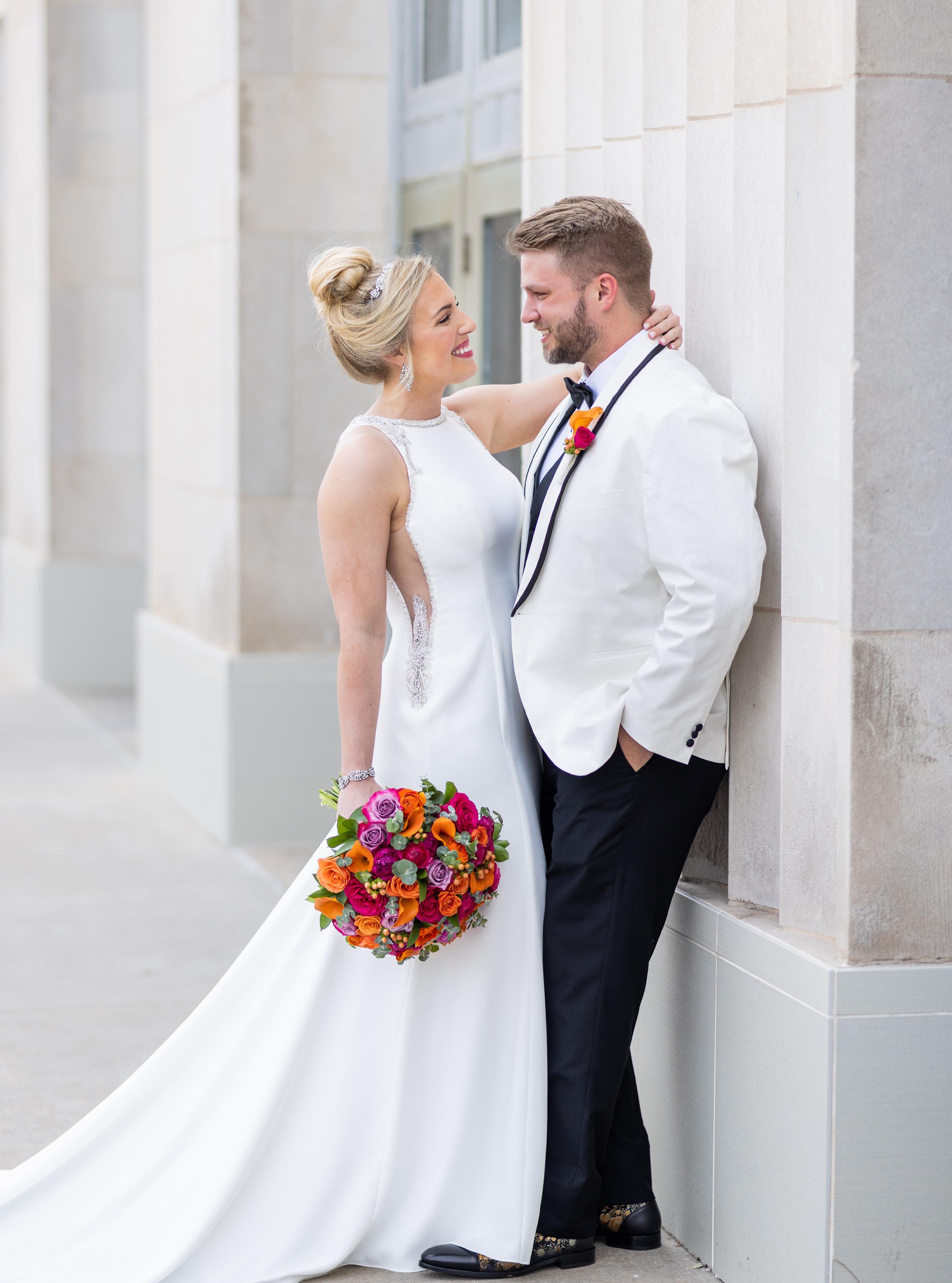 A bright and cheerful palette of coral, pink, teal, and yellow perfectly represented this couple. Intentional family details were incorporated into the wedding reception using vases Chelsey’s grandma had collected over the years and that they even thrifted together!