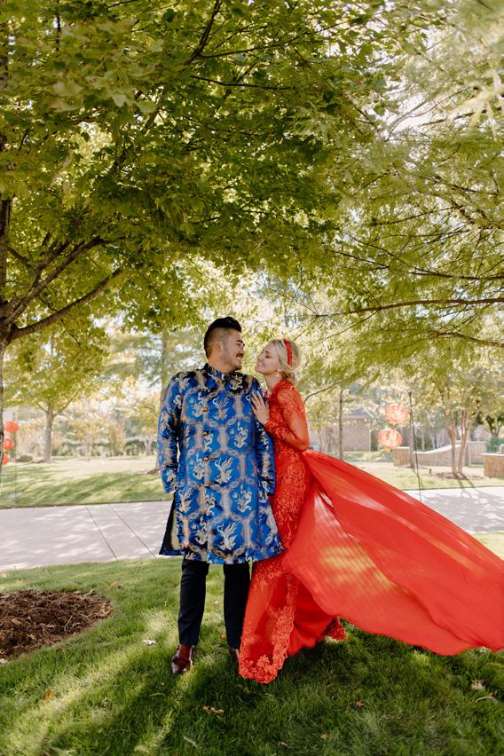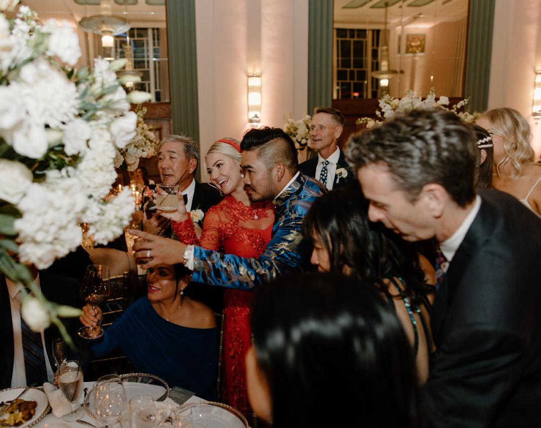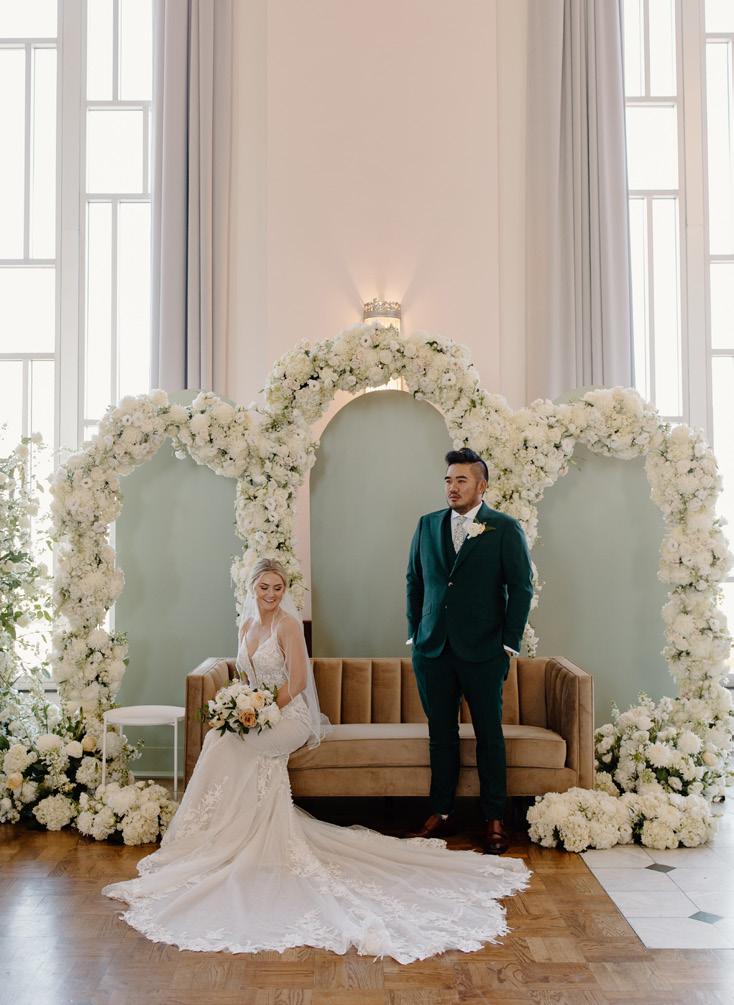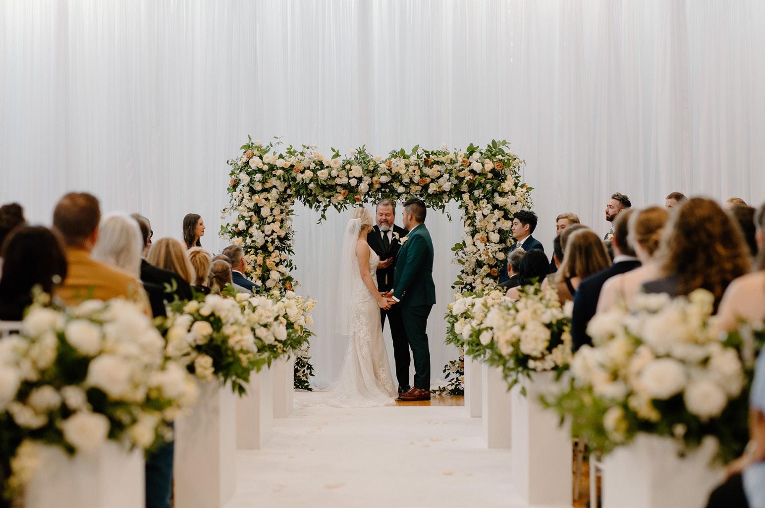 This modern Vietnamese wedding beautifully merged traditional customs with contemporary aesthetics, featuring lavish floral arrangements that adorned the ceremony and reception venue, complete with a full living bar.