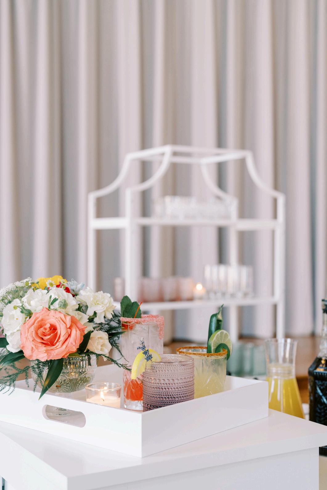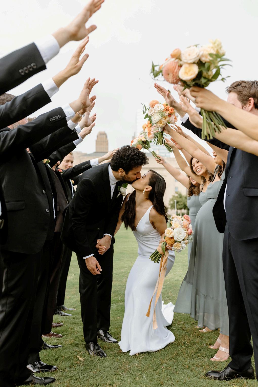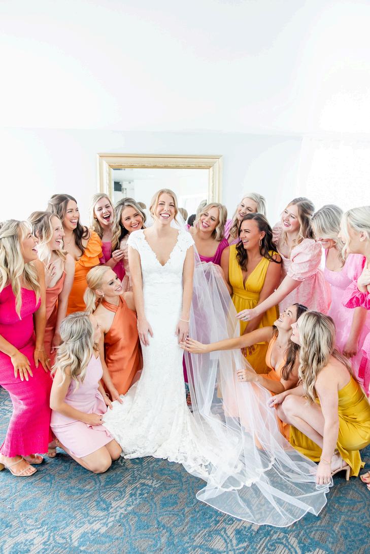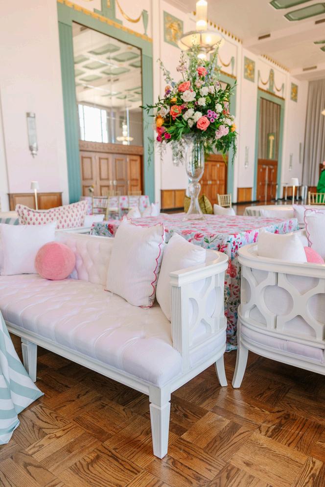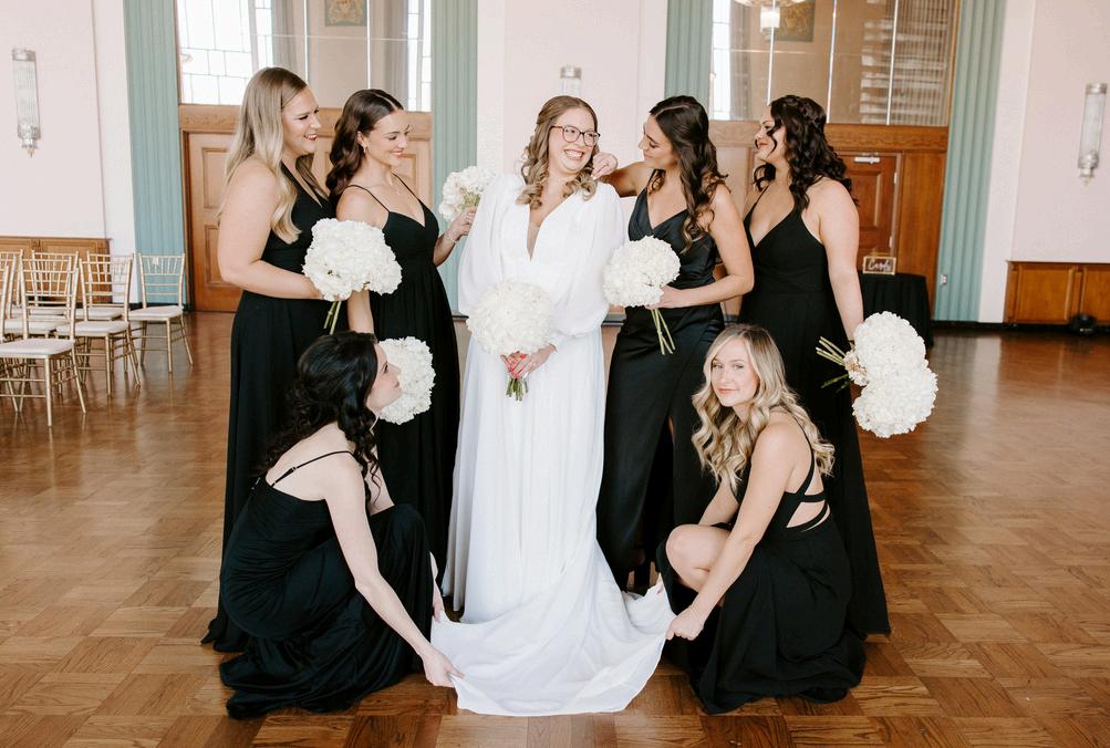 The florals were created with extra love by the Bride’s sister! This celebration also had beautiful bow details that spanned from the custom statement bow on her gown, her bridesmaids’ dresses, to the cake and even accents down the aisle!