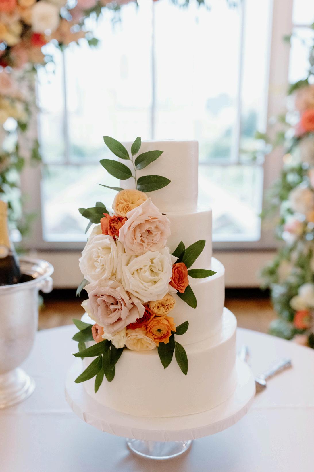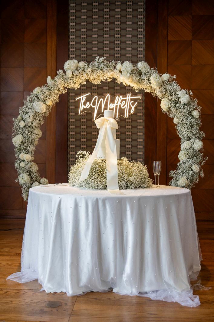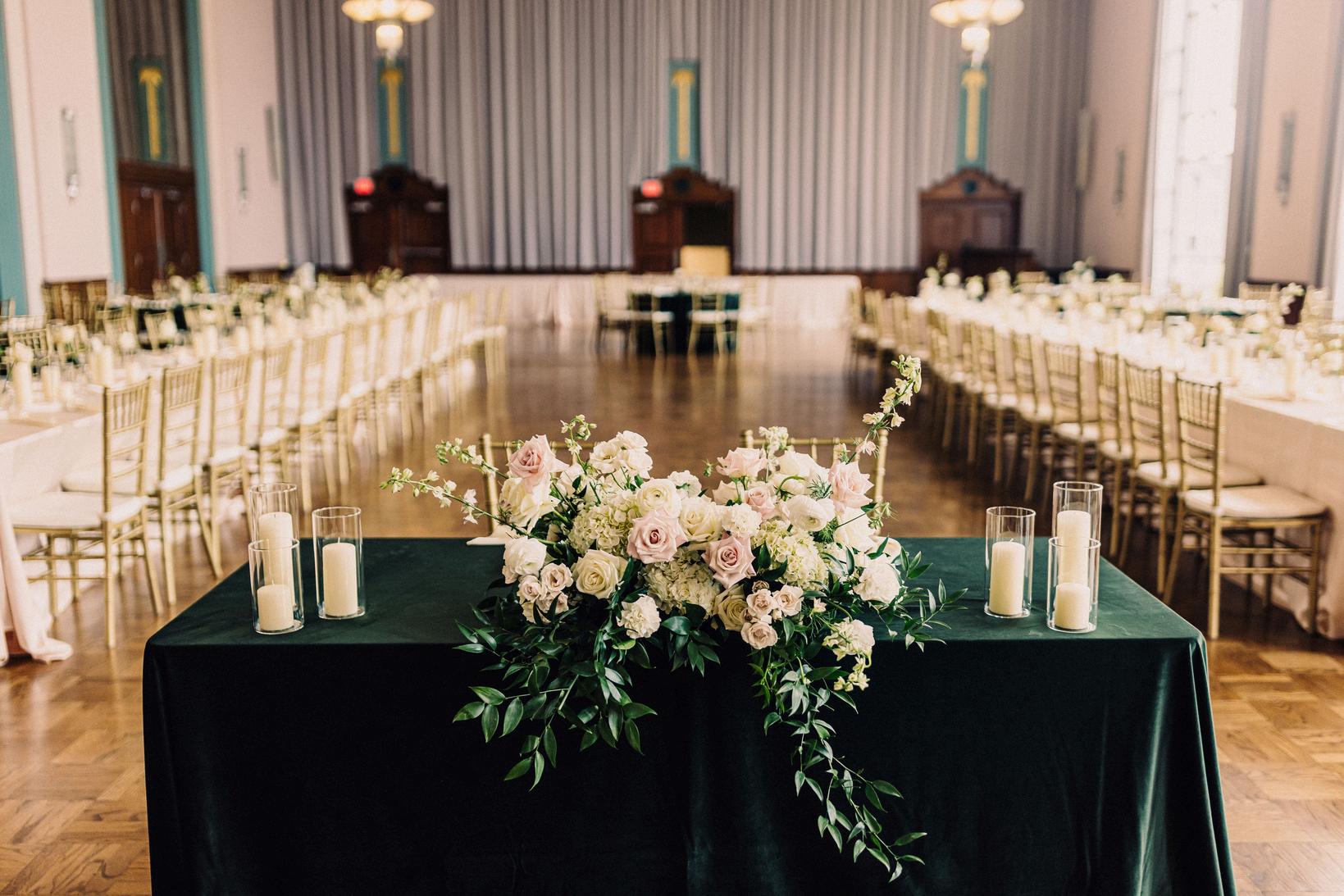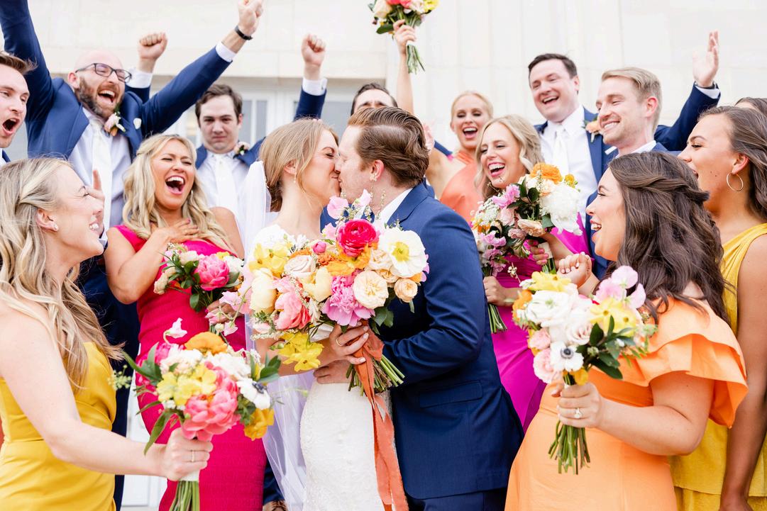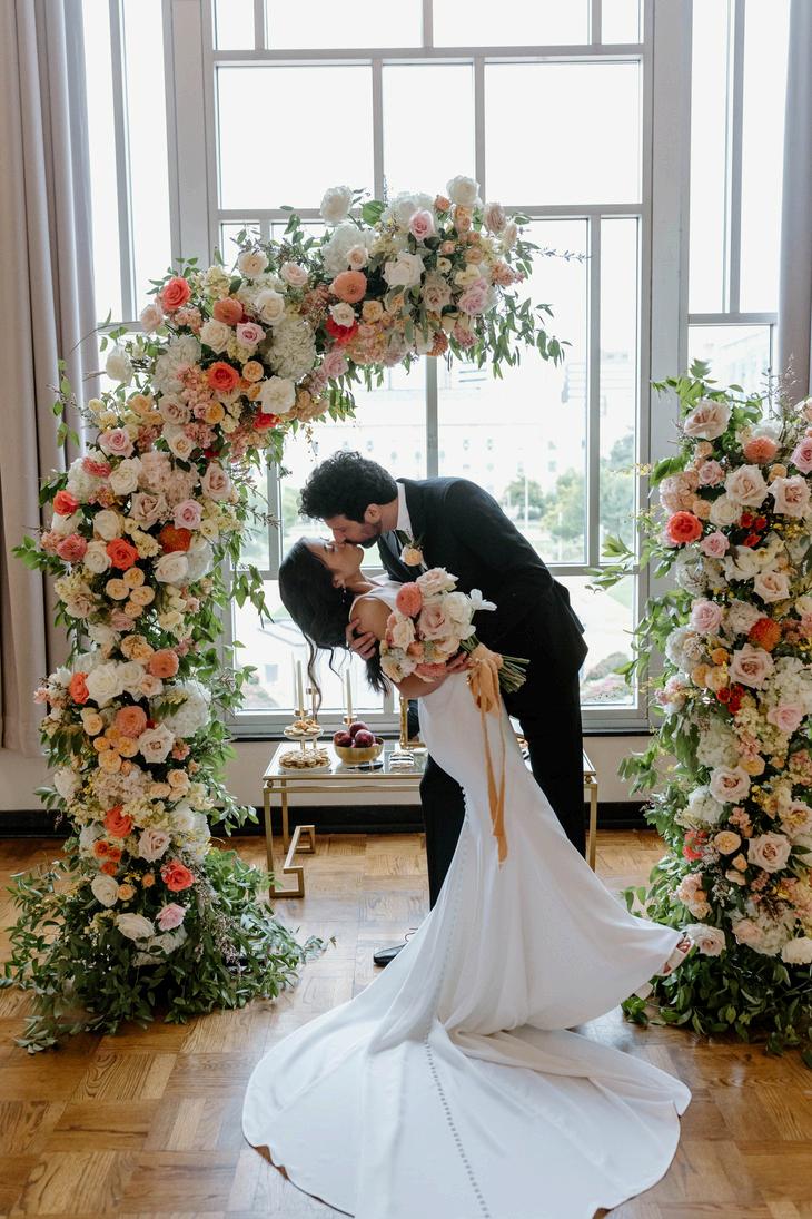 The florals were created with extra love by the Bride’s sister! This celebration also had beautiful bow details that spanned from the custom statement bow on her gown, her bridesmaids’ dresses, to the cake and even accents down the aisle!