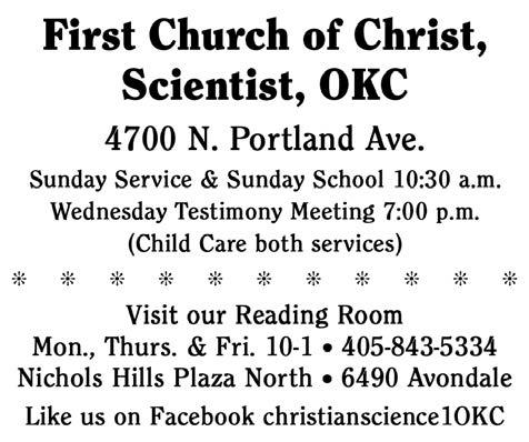 Christian Science Reading Room 6490 Avondale Drive (Nichols Hills Plaza North) Nichols Hills, OK 73116 (405) 843-5334 christianscienceokc.org