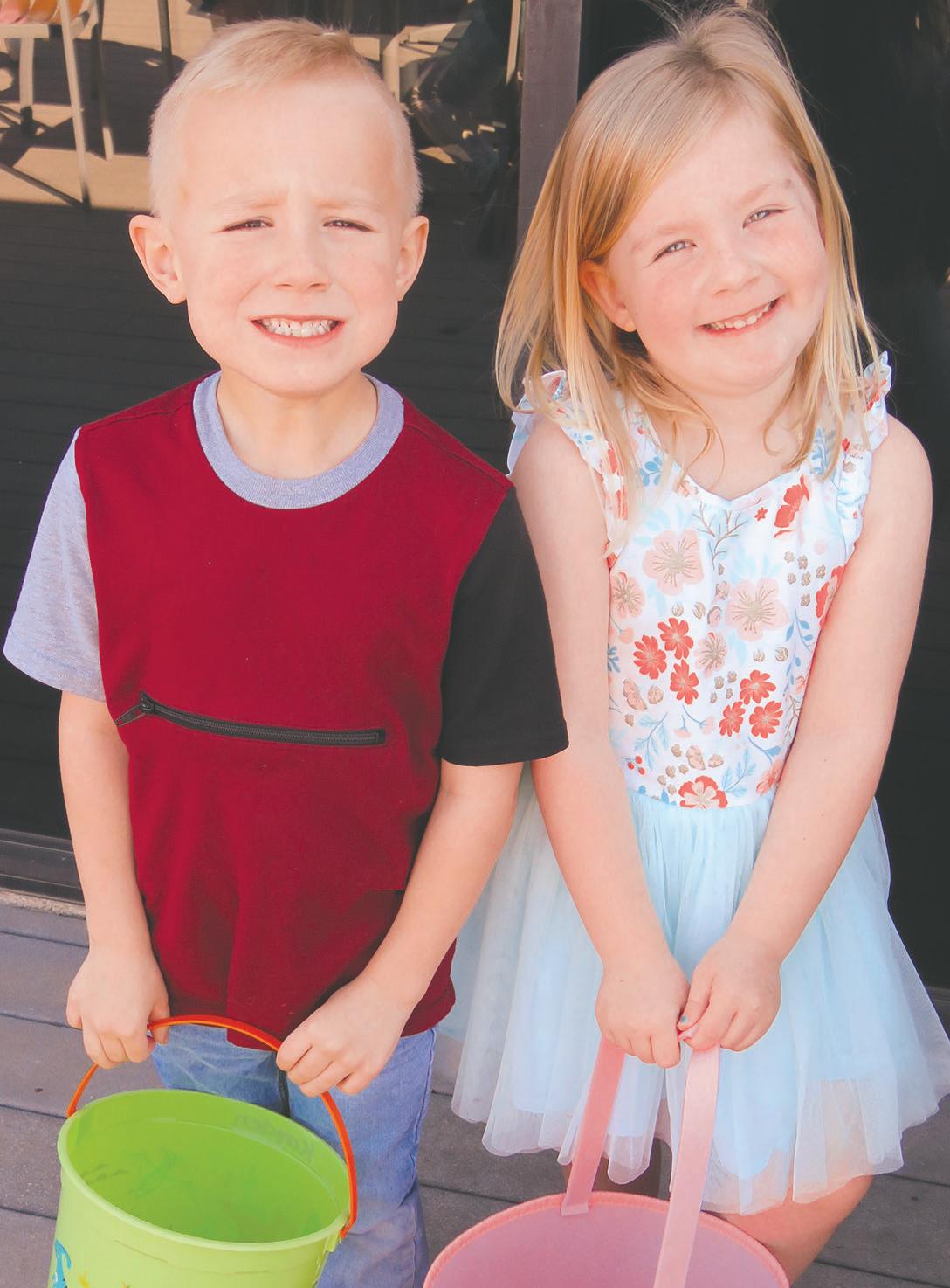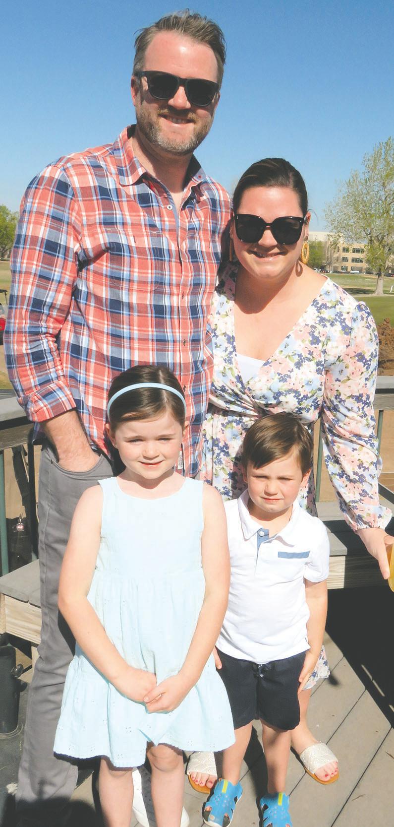 It’s raining eggs! The Easter Bunny is dropping eggs from a helicopter for The Greens Golf and Country Club Egg Hunt. Above: Kaden Wise and Eliza Moates watch in wonder. At right: Family time at the club, back, Scott and Macy Davis with their egg-hunting enthusiast children Kate and Fisher.