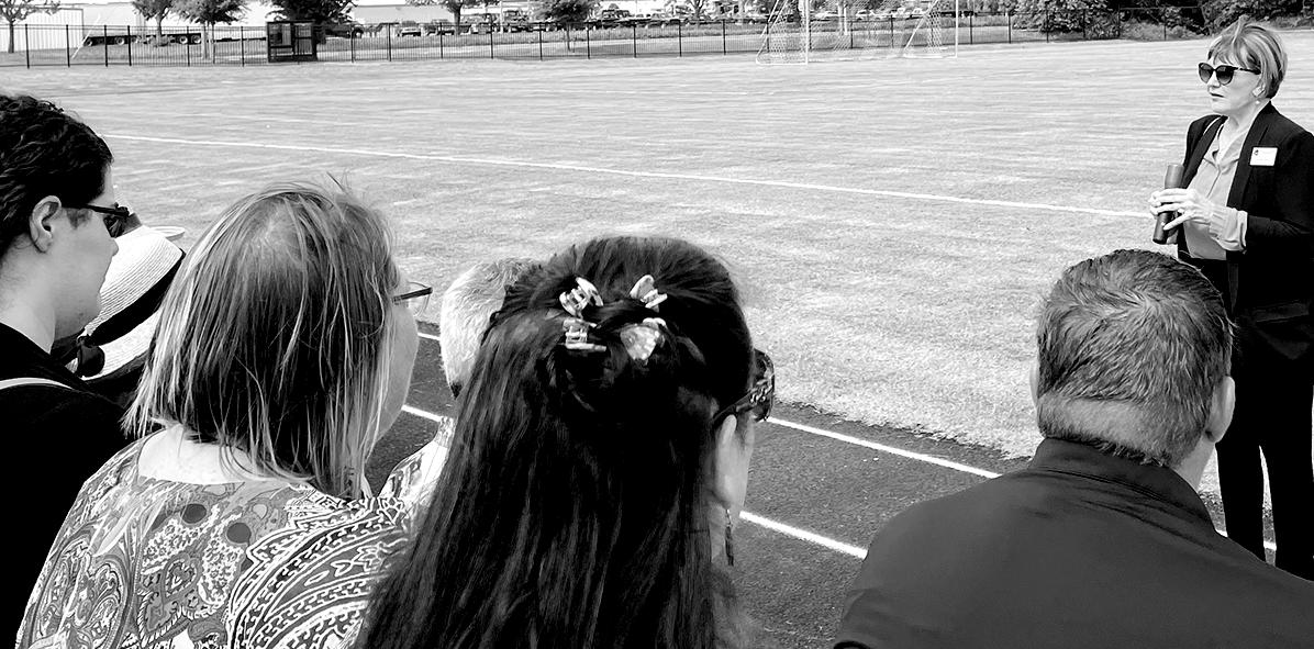 Dr. Freda Deskin, ASTEC CEO & Founder, at far right, addresses supporters at the soccer field dedication ceremony.