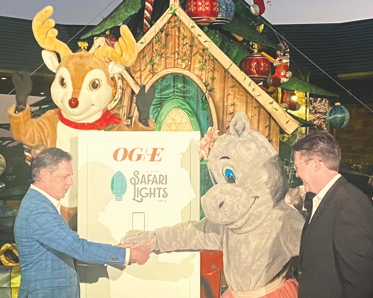 Above: OG&E President and CEO Sean Trauschke, the Zoo’s hippo mascot and OKC Zoo Executive Director and CEO Dwight Lawson throw the switch on the Safari Lights. At right: Lillie-Beth Brinkman swings on one of the illuminated interactive features at the Zoo. Safari Lights continues through Jan. 4, 5:30-11 p.m. nightly. For tickets, visit okczoo.org.