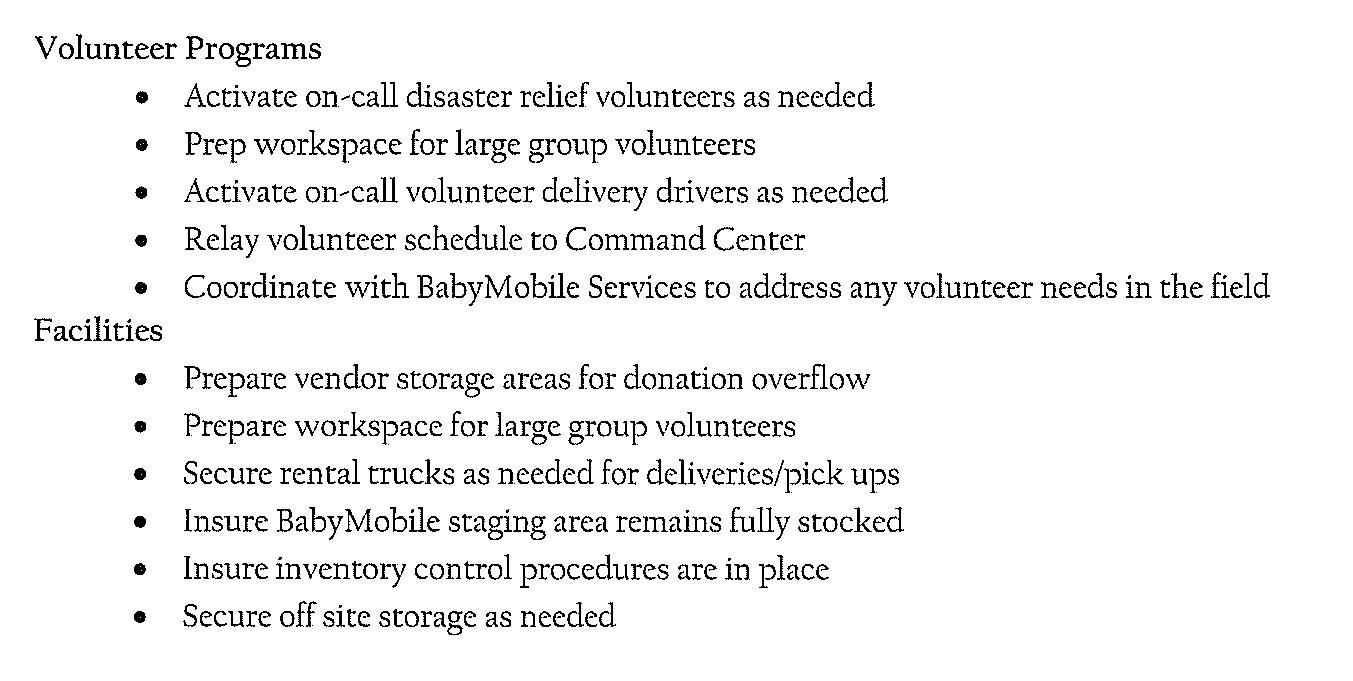 Infant Crisis Services Internal Disaster Relief Plan Continued